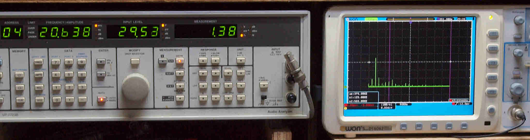 | E. 調整・測定。画像をクリックすると、大きく(横幅2050ドット)表示されます。 E0. 出力・歪み率測定・調整。 「見方」。 上段中 右側SP出力を「Audio Analyzer Panasonic VP−7723B」により測定。 表示LED、 左端=メモリーNo、 中左=周波数測定、 中右=出力電圧測定、 右端=歪み率測定。 上段右端 VP−7723Bの基本波除去出力を「owon SDS8202(200MHZ)」で「FFT分析」表示。 下段中 左側SP出力を「Audio Analyzer Panasonic VP−7723B」により測定。 表示LED、 左端=メモリーNo、 中左=周波数測定、 中右=出力電圧測定、 右端=歪み率測定。 下段右端 VP−7723Bの基本波除去出力を「owon SDS6062(200MHZ)」で「FFT分析」表示。 下段左端 オーディオ発振器 VP−7201A より50Hz〜100kHzの信号を出し(歪み率=約0.003%)、ATT+分配器を通し、AMPに入力。 よって、ダイアル設定出力レベルより低くなります。測定機器の仕様や整備の様子はこちら、「VP−7723B」「VP−7201A」。 FFT画面の見方はこちら。 測定条件。 使用終段「6LF6」は付いていたのを使用。 バイアス電流値。 1本目6LF6=100mA 2本目6LF6=100mA 3本目6LF6=80mA 4本目6LF6=80mA 5本目6LF6=75mA 6本目6LF6=80mA 7本目6LF6=100mA 8本目6LF6=70mA 飽和出力は200Wを越えます。 |