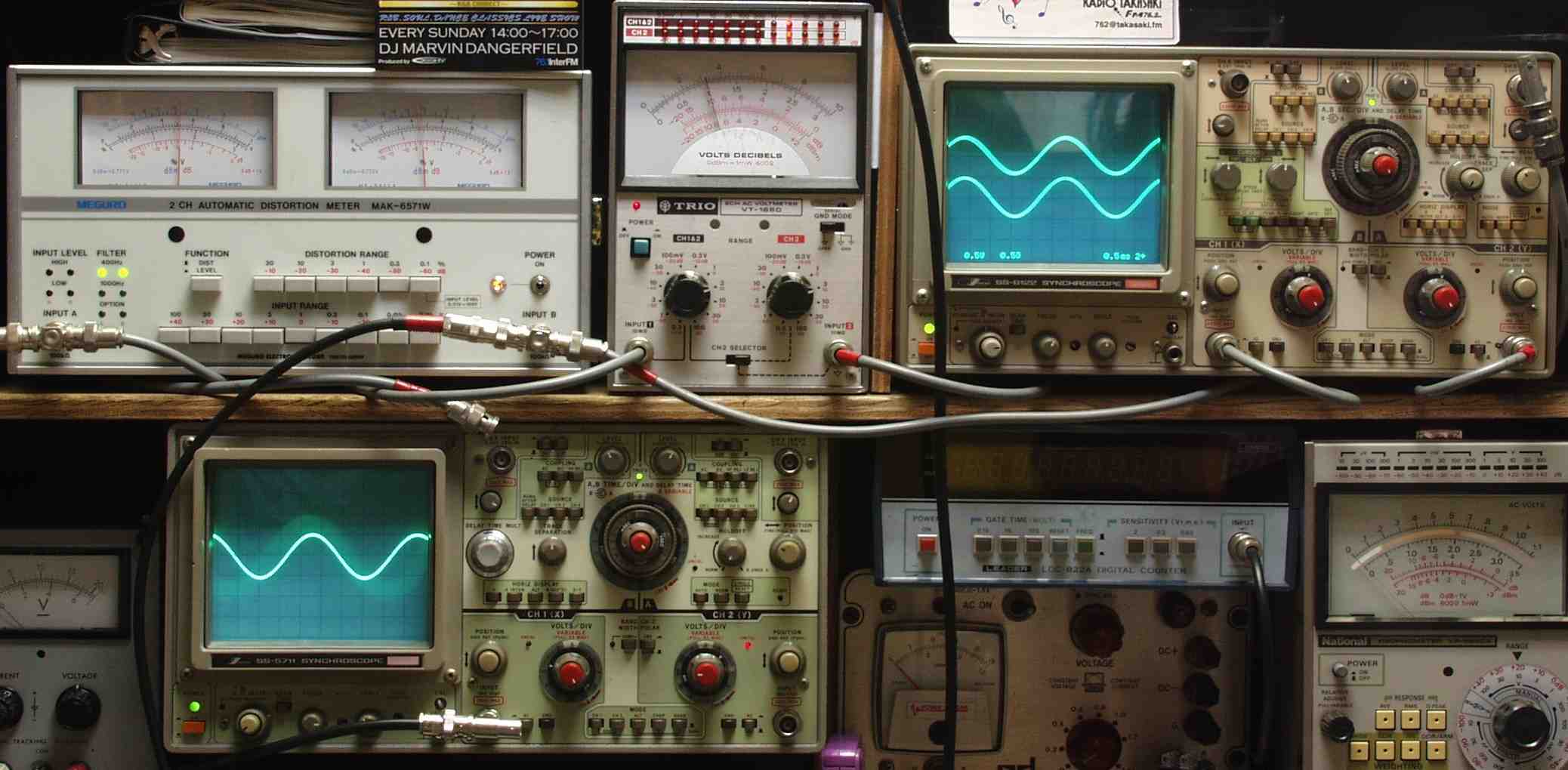 | E. 調整・測定 E1.調整・出力測定 <見方> 上左オーデオ発振器より400HZ・1KHZの信号を出す(歪み率=約0.003%) 下中=入力波形(オーデオ発振器のTTLレベル) 下右=周波数計 上左=SP出力の歪み率測定 左メ−タ−=L出力、右メ−タ−=R出力 上中=SP出力電圧測定器、赤針=R出力、黒針=L出力 上右=SP出力波形オシロ 上=R出力、下=L出力(出力電圧測定器の出力) |