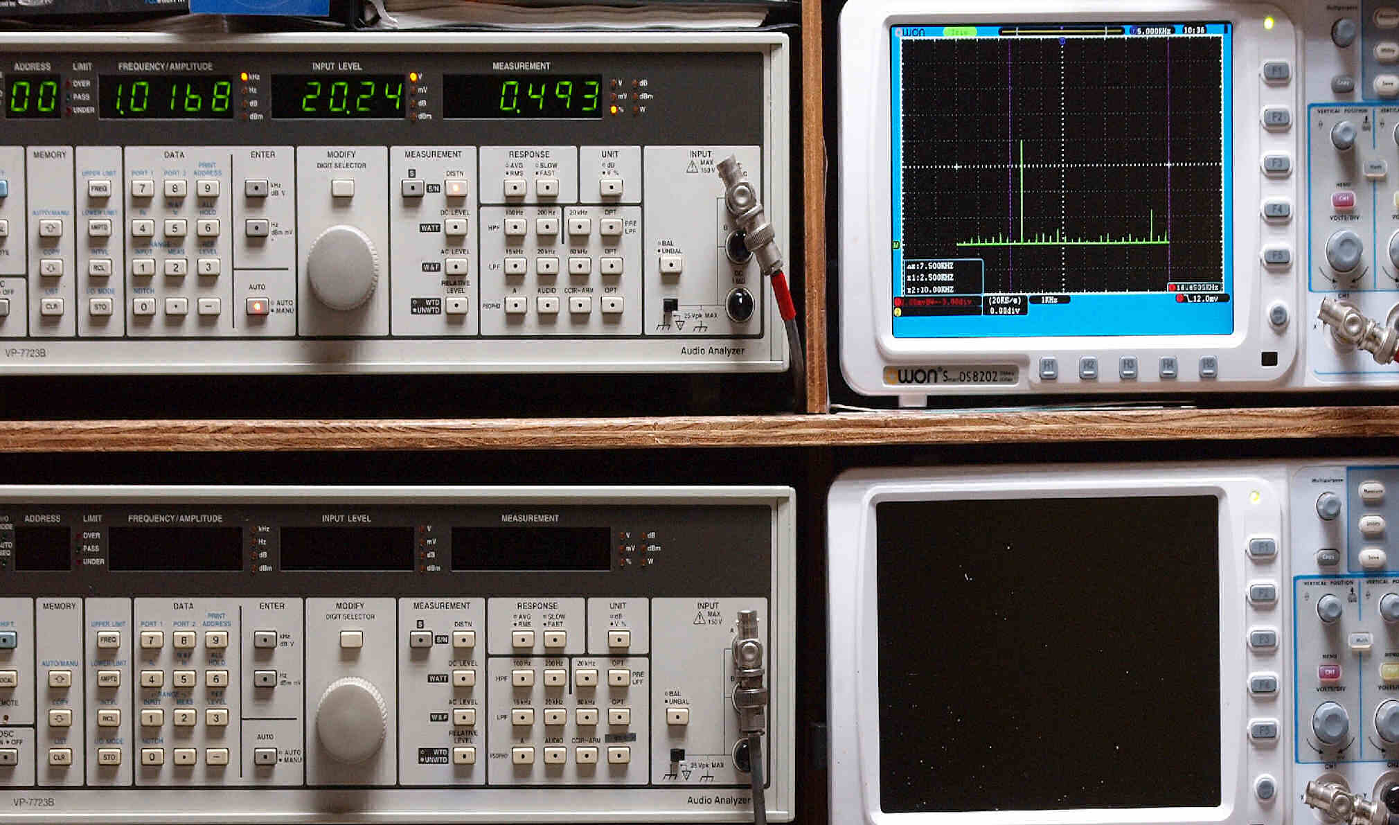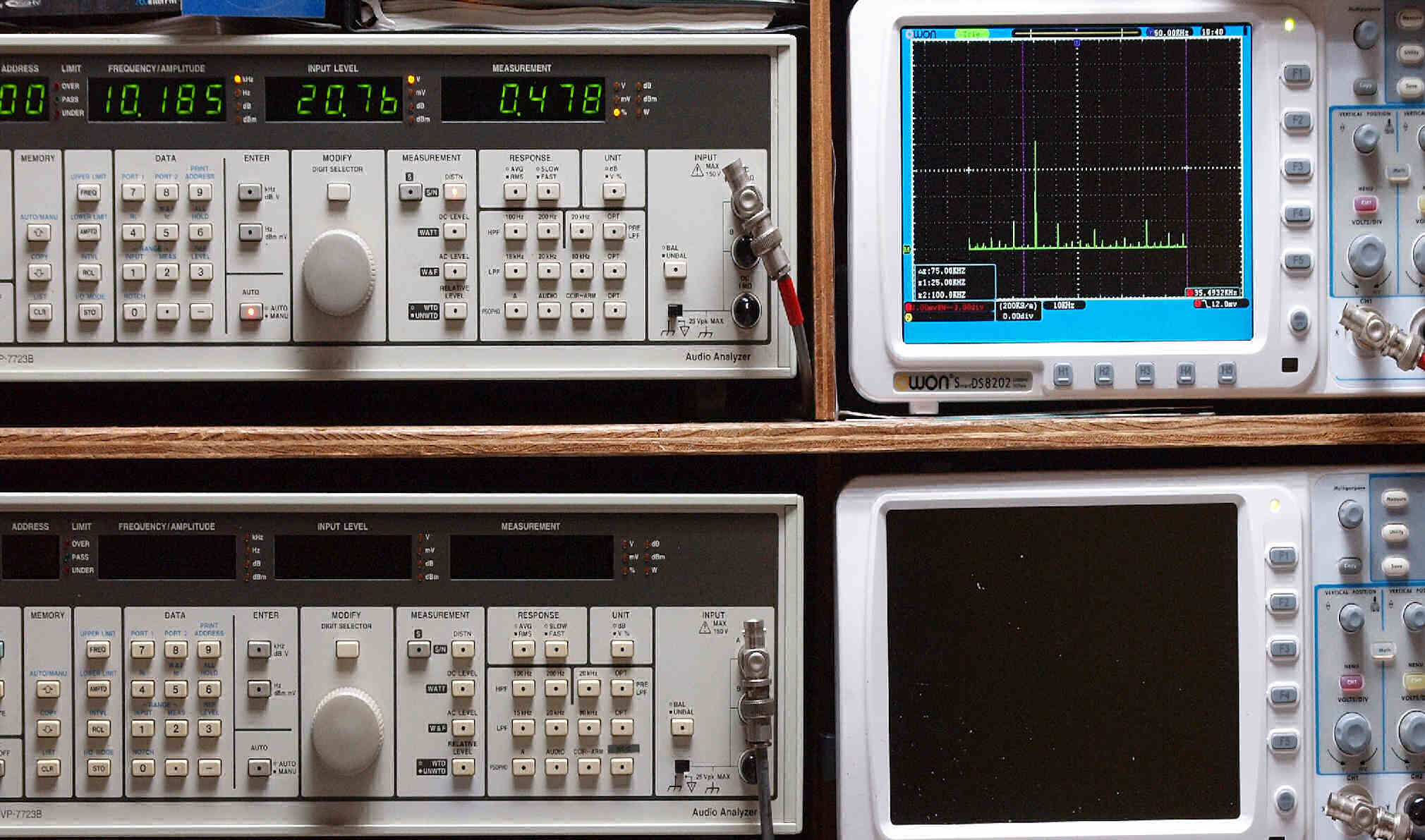 | E. 測定・調整。画像をクリックすると、大きく(横幅2050ドット)表示されます。 E1. 出力・歪み率測定・調整 「見方」。 上段中 右側SP出力を「Audio Analyzer Panasonic VP−7723B」により測定。 表示LED、 左端=メモリーNo、 中左=周波数測定、 中右=出力電圧測定、 右端=歪み率測定。 上段右端 VP−7723Bの基本波除去出力を「owon SDS8202(200MHZ)」で「FFT分析」表示。 下段中 左側SP出力を「Audio Analyzer Panasonic VP−7723B」により測定。 表示LED、 左端=メモリーNo、 中左=周波数測定、 中右=出力電圧測定、 右端=歪み率測定。 下段右端 VP−7723Bの基本波除去出力を「owon SDS6062(200MHZ)」で「FFT分析」表示。 下段左端 オーディオ発振器 VP−7201A より50Hz〜100kHzの信号を出し(歪み率=約0.003%)、ATT+分配器を通し、AMPに入力。 よって、ダイアル設定出力レベルより低くなります。測定機器の仕様や整備の様子はこちら、「VP−7723B」「VP−7201A」。 FFT画面の見方はこちら。 |