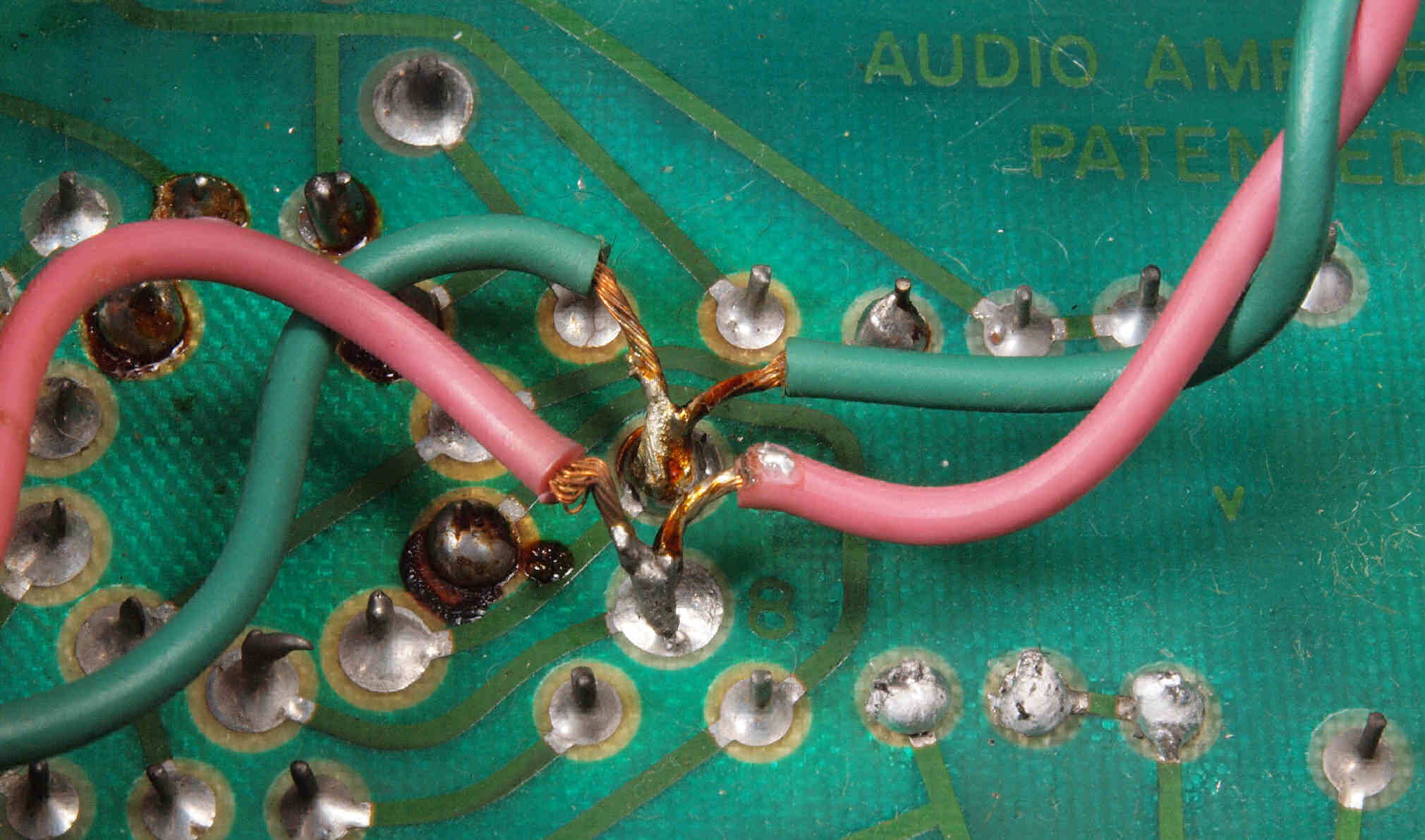C61. 修理中 基板鳩目端子への結線は先を折り返し、接触面積を広げる。