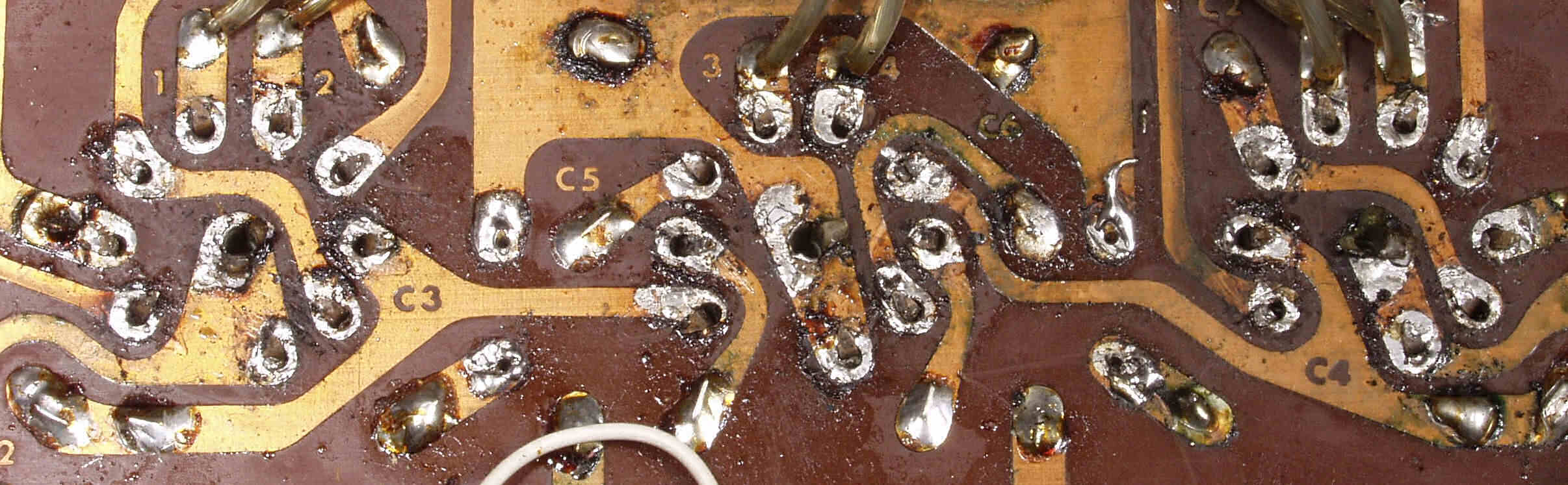 | C1F. 修理前 前段基板裏 MTソケットの足に十分半田が付いていない | ||||||||||||||||||||||||||||||||||||||