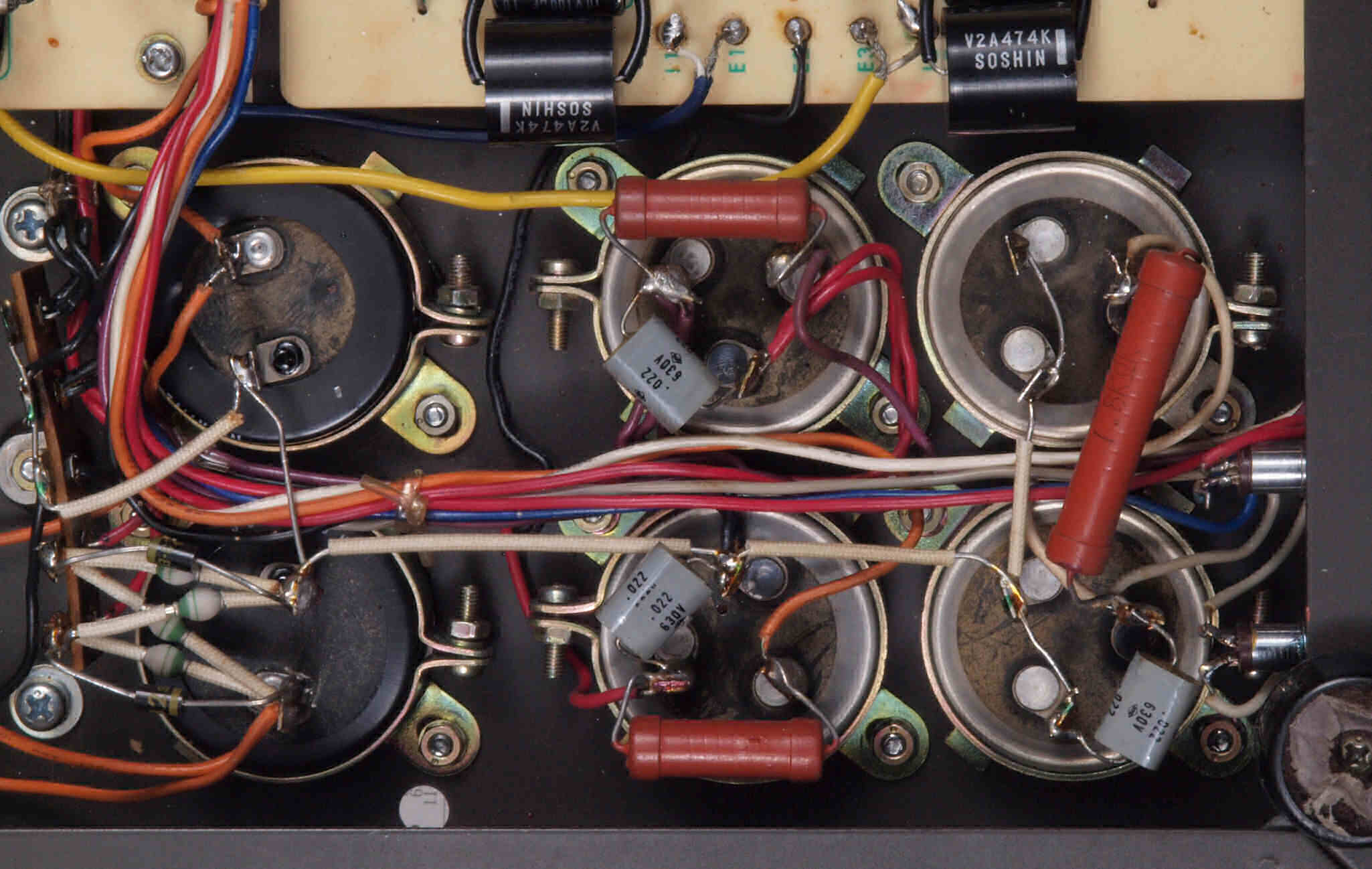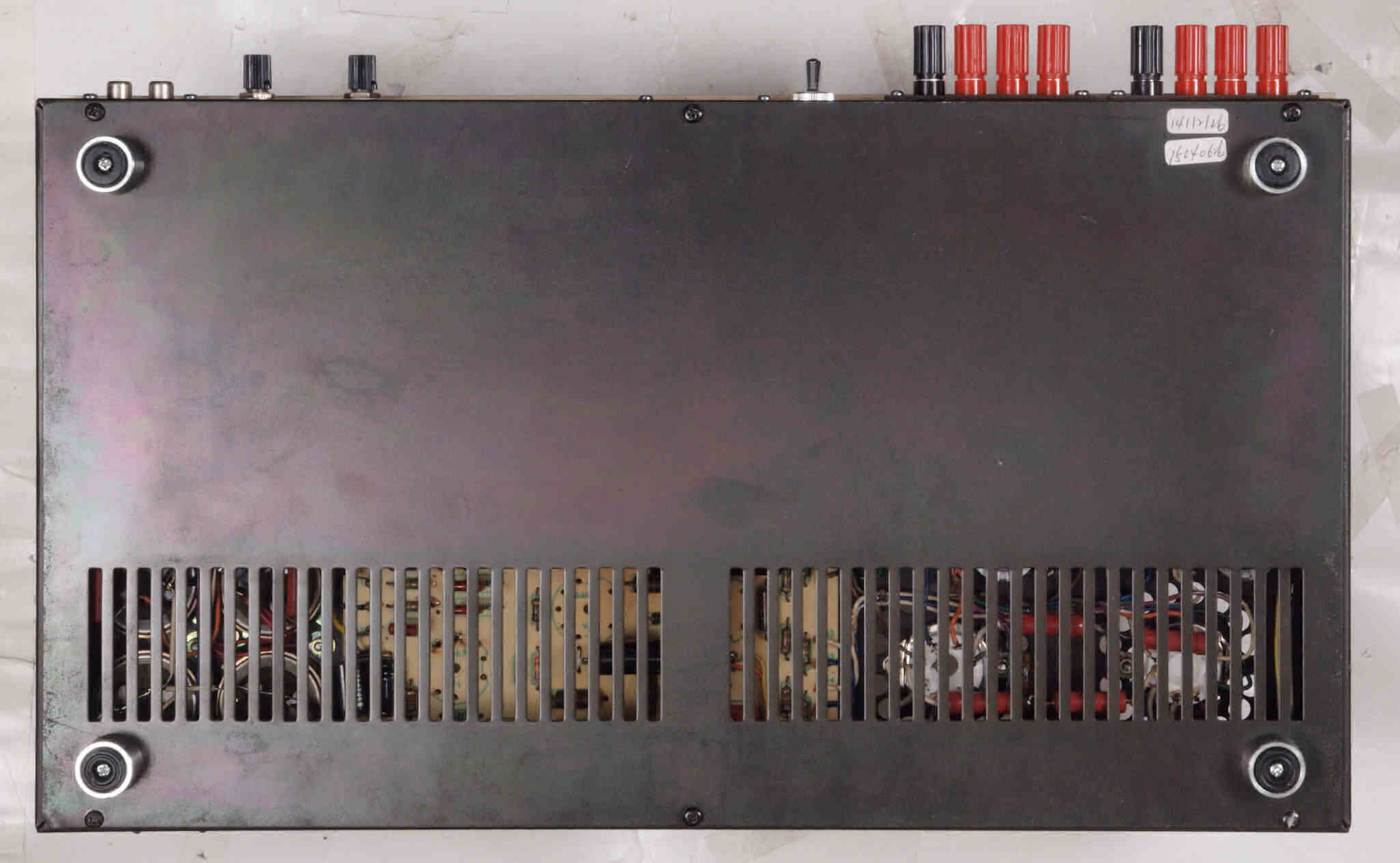 A43. 点検中 下蓋を外し、下から見る。L側終段出力真空管6336Aのグリッド抵抗に少し焼けあり。