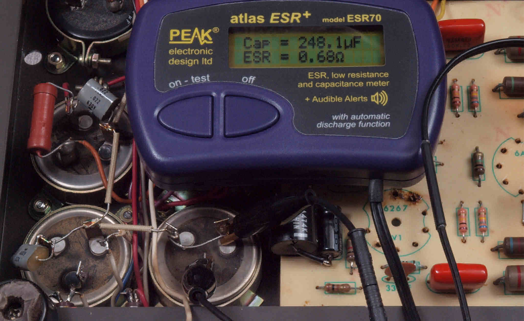 C6B. 修理中 交換する前段用ブロック電解コンデンサー容量、ESR測定。(100μ/350V)×2。