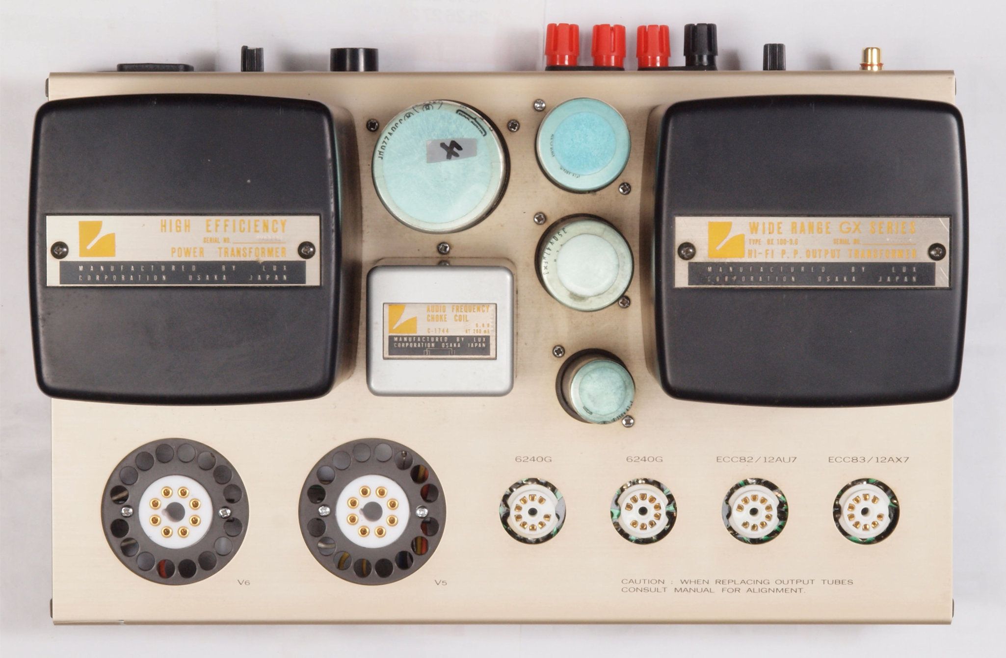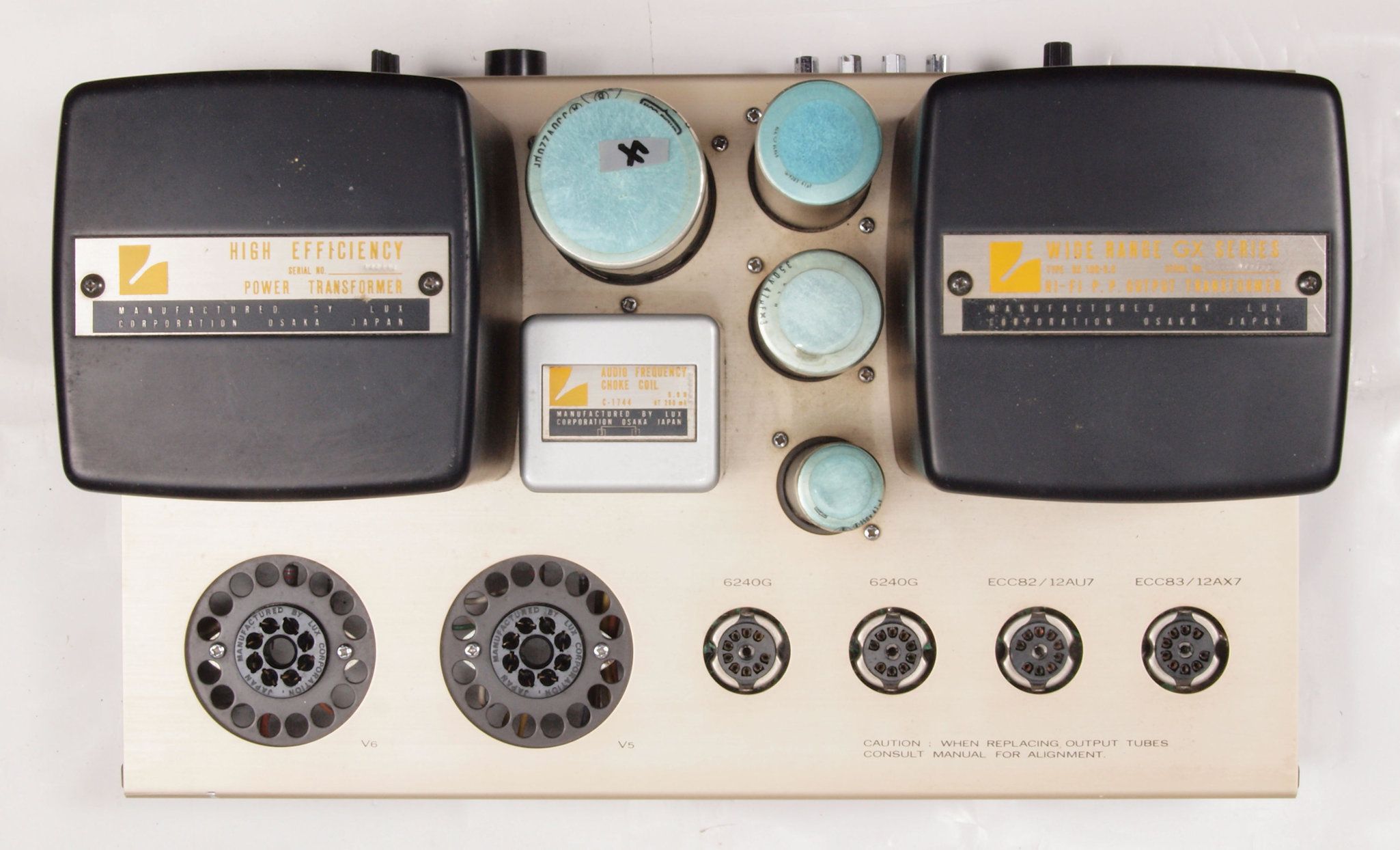 | CA5 完成後 前上から見る。8045G2本、6240G2本、12AU7、12AX7。 | ||||||||||||||||||||||||