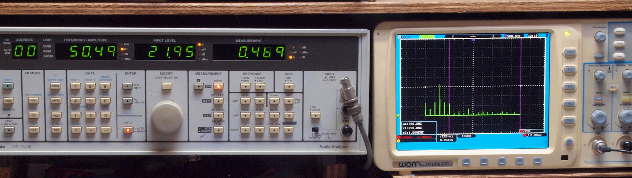 | E. 測定・調整。 画像をクリックすると、大きく(横幅2050ドット)表示されます。 E0. 出力・歪み率測定・調整 「見方」。 左=SP出力を「Audio Analyzer Panasonic VP−7723B」により測定。 表示LED、 左端=メモリーNo、 中左=周波数測定、 中右=出力電圧測定、 右端=歪み率測定。 右=VP−7723Bの基本波除去出力を「owon SDS6062(200MHZ)」で「FFT分析」表示。 オーディオ発振器 VP−7201A より50Hz〜100kHzの信号を出し(歪み率=約0.003%)、ATT+分配器を通し、AMPに入力。 よって、ダイアル設定出力レベルより低くなります。測定機器の仕様や整備の様子はこちら、「VP−7723B」「VP−7201A」。 FFT画面の見方はこちら。 |