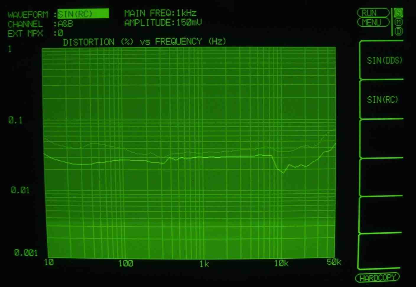 | F3B. 歪み率測定 MM入力 左出力=薄(細い)色 右出力=濃い(太い)色 MM入力端子に0.8mV一定入力 VRはmax この測定器は入力レベルが変化すると、正しく測定できない、 入力に逆RIAAフイルタ−を入れ、入力レベルを一定にしないと、正確な測定は出来ないので参考程度 |