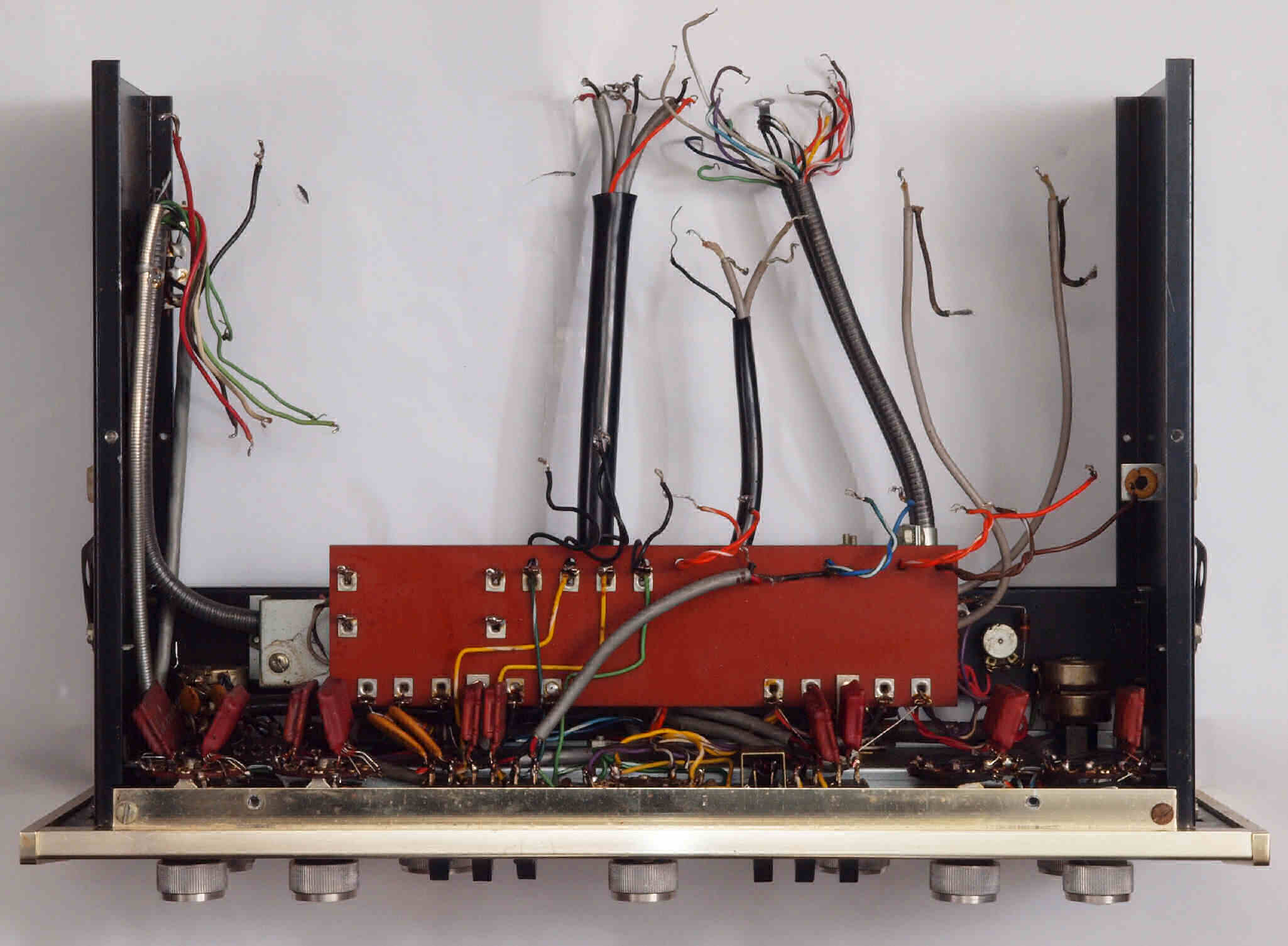 C54. 修理後  電源部シャーシ裏。 整流器、電解コンデンサー全部交換する。出力遅延回路組み込み。