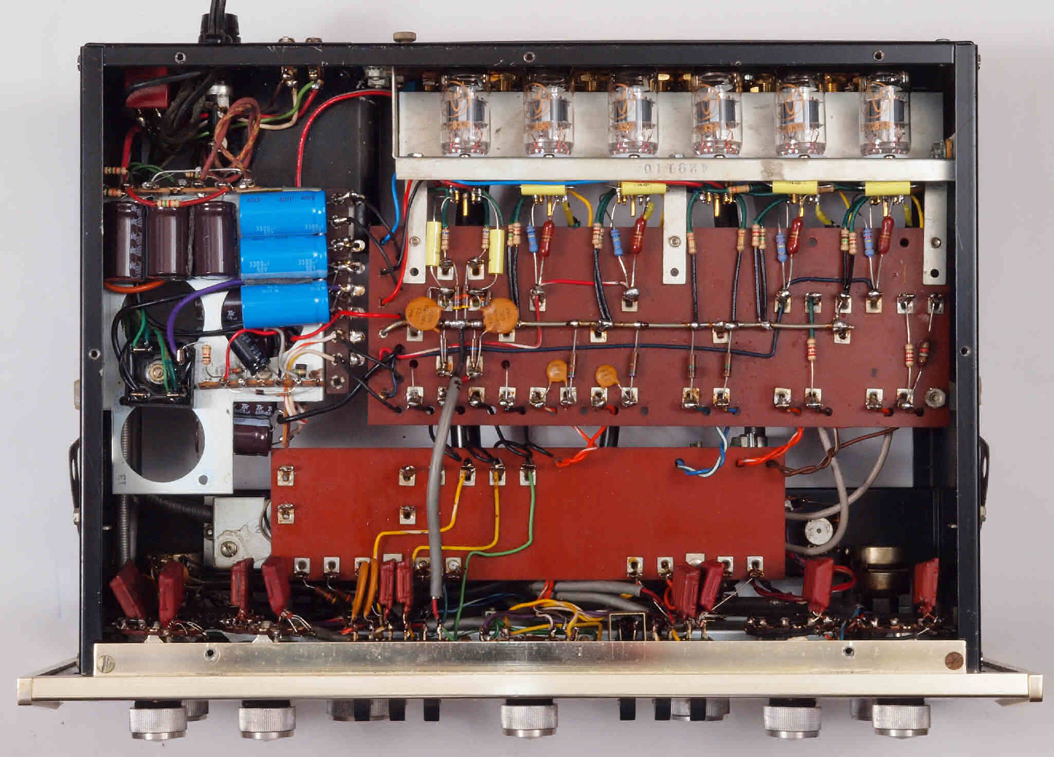 C11. 修理中 真空管基板、電源シャシ、前パネルを外して修理する。 上から見る。