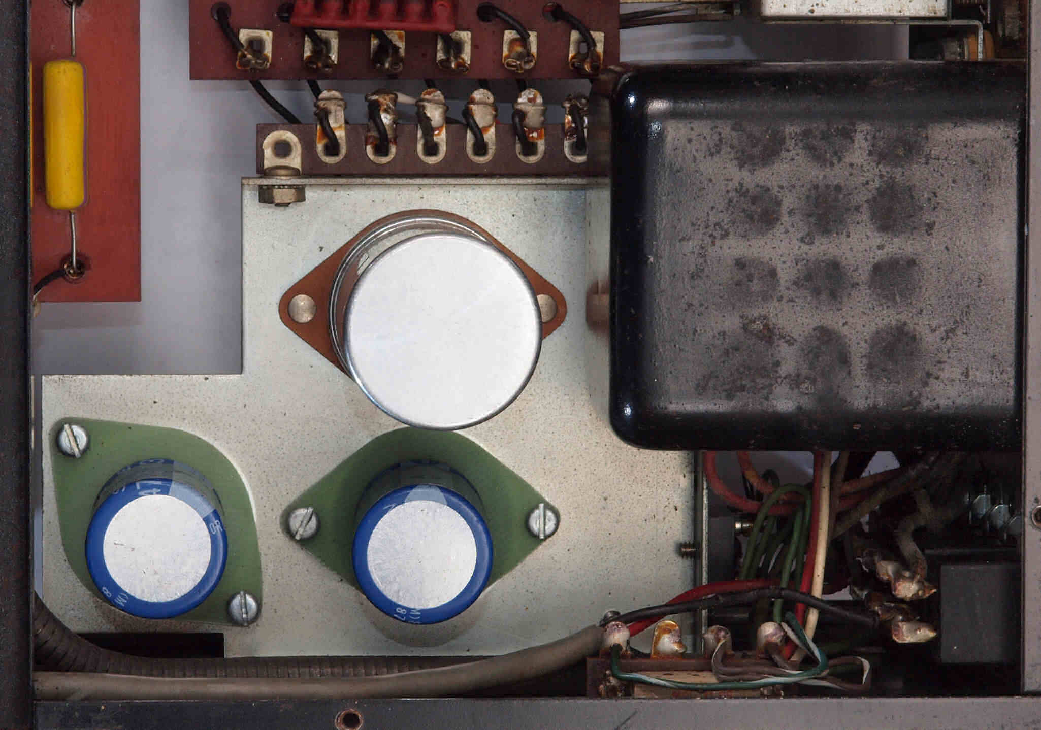 C532. 修理中 電源部シャーシ裏。 ラグ端子板に穴開け加工して電解コンデンサー取付。かなりの技量です。