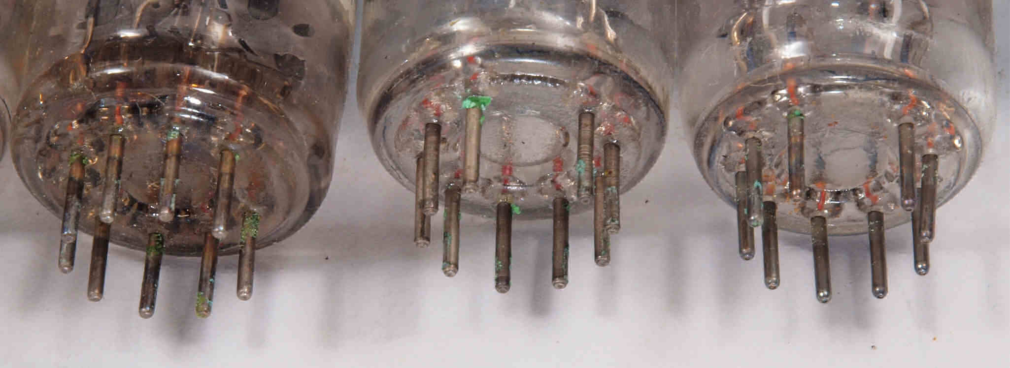 A83. 点検中 付属真空管、足から見る。足に腐食の緑青がでている。