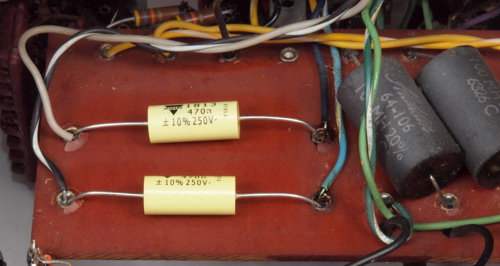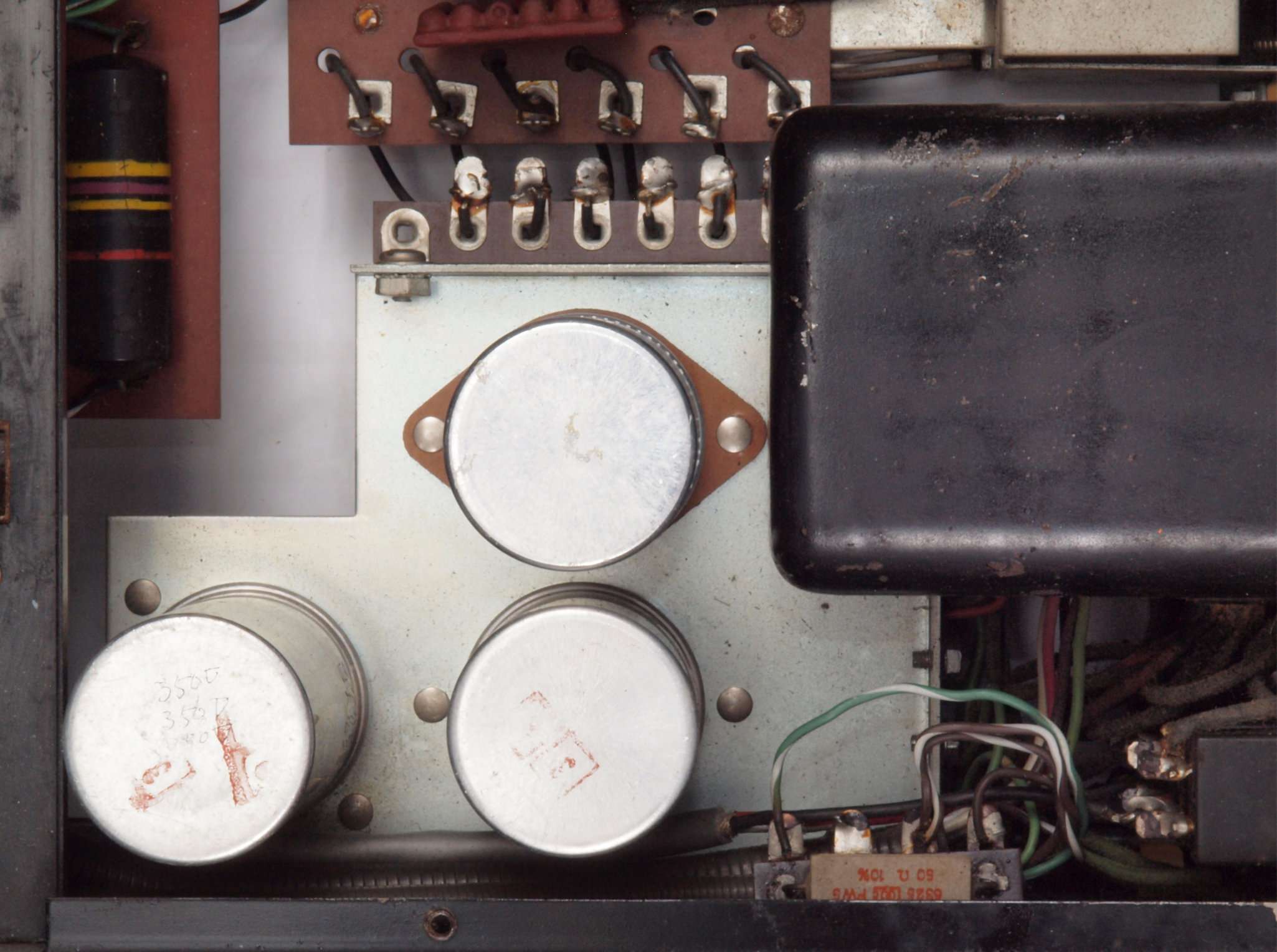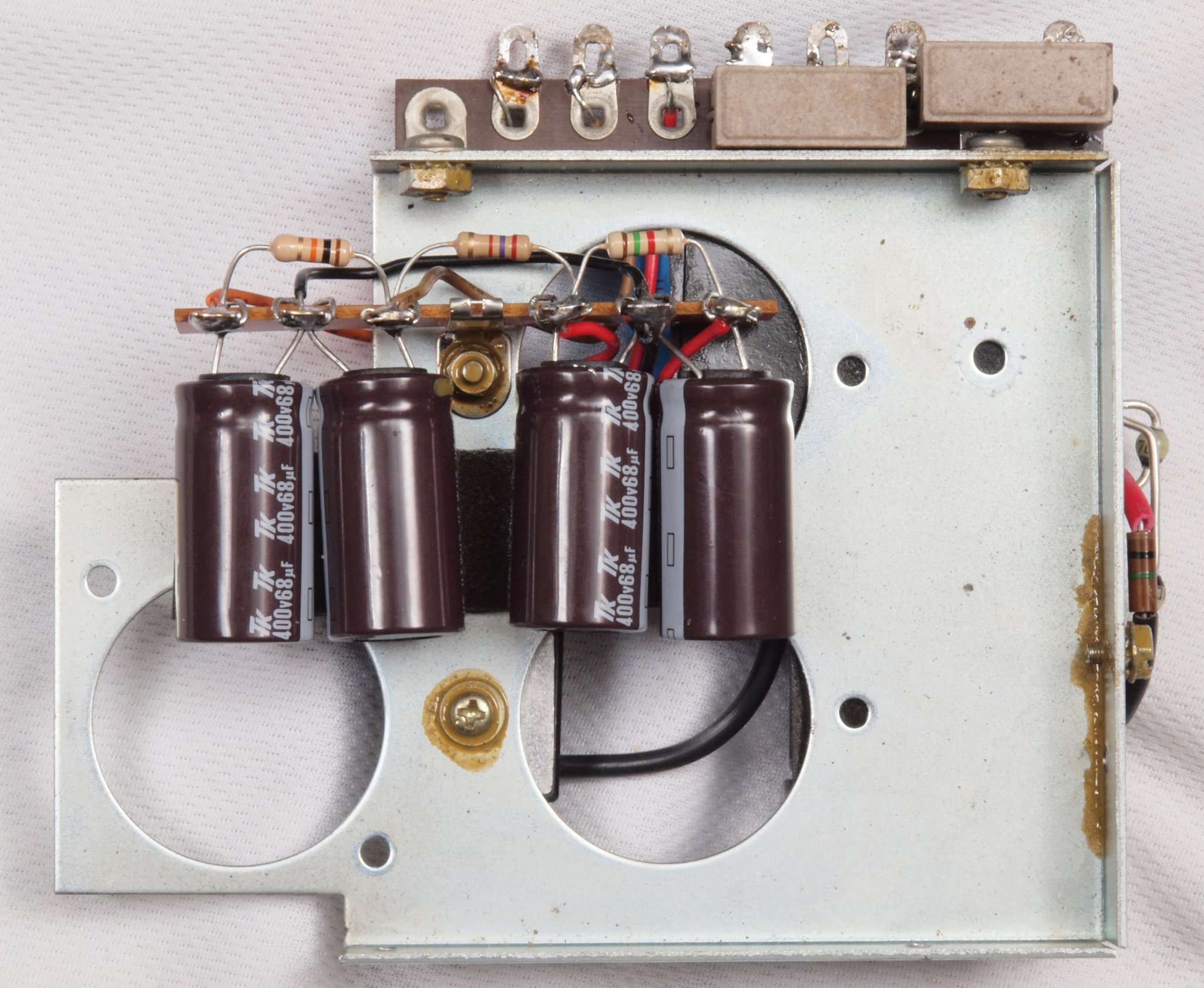 C54. 修理後  電源部シャーシ裏。 整流器、電解コンデンサー全部交換する。出力遅延回路組み込み。