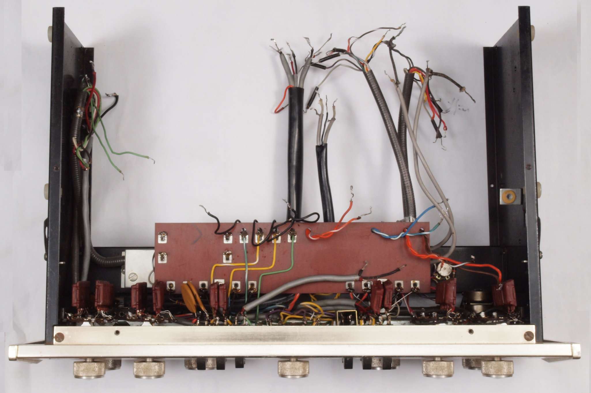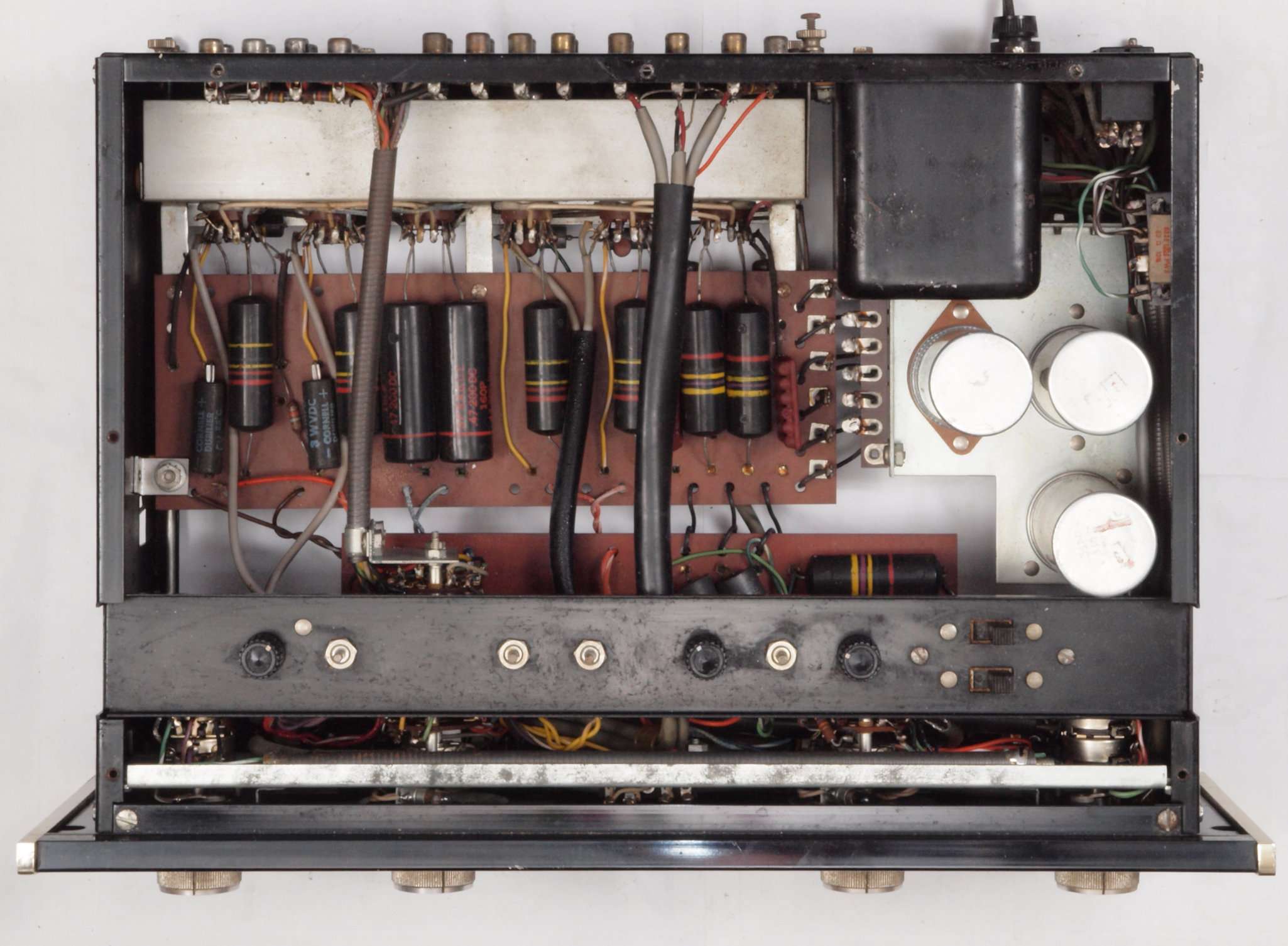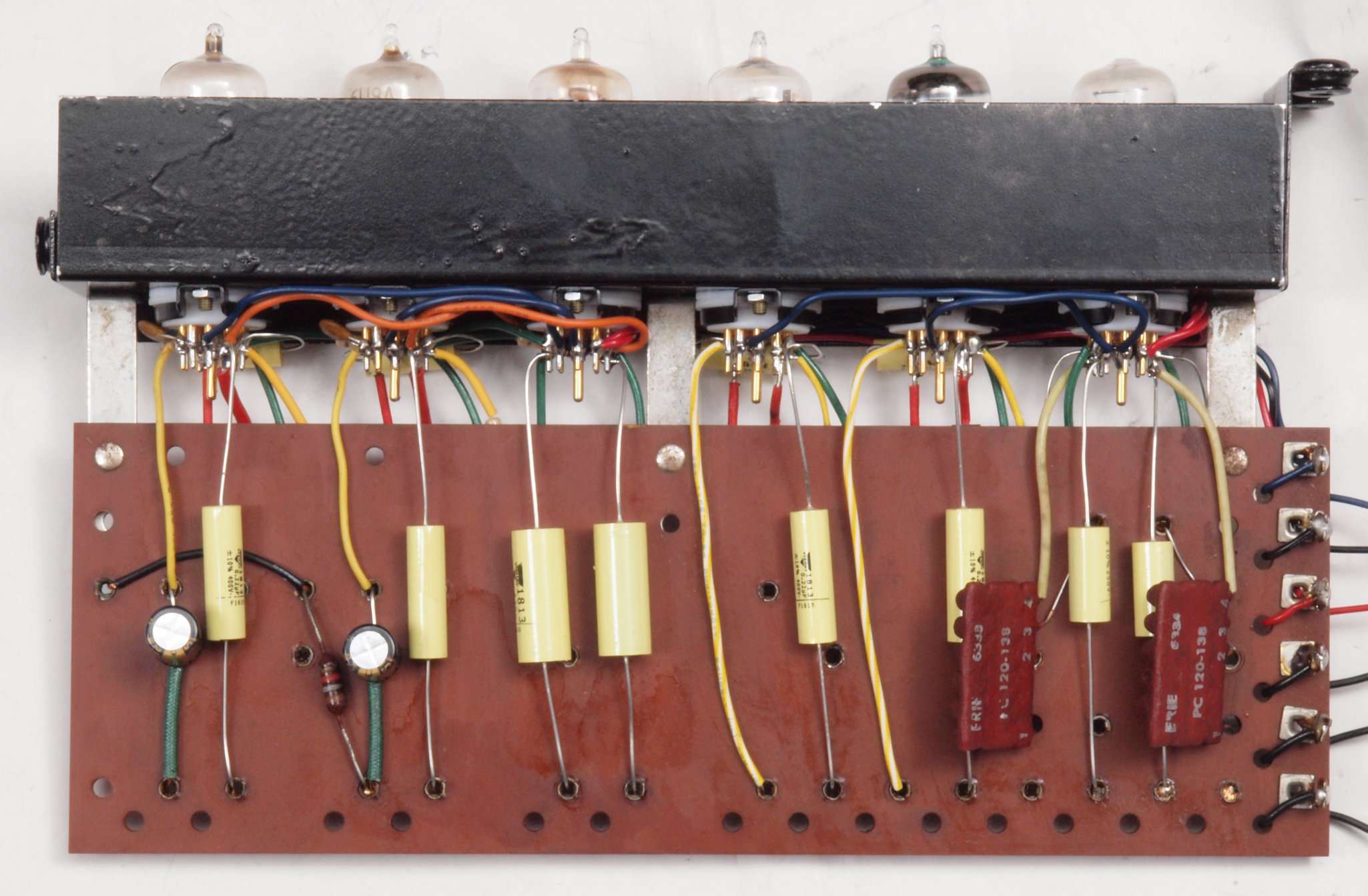 C54. 修理後  電源部シャーシ裏。 整流器、電解コンデンサー全部交換する。出力遅延回路組み込み。