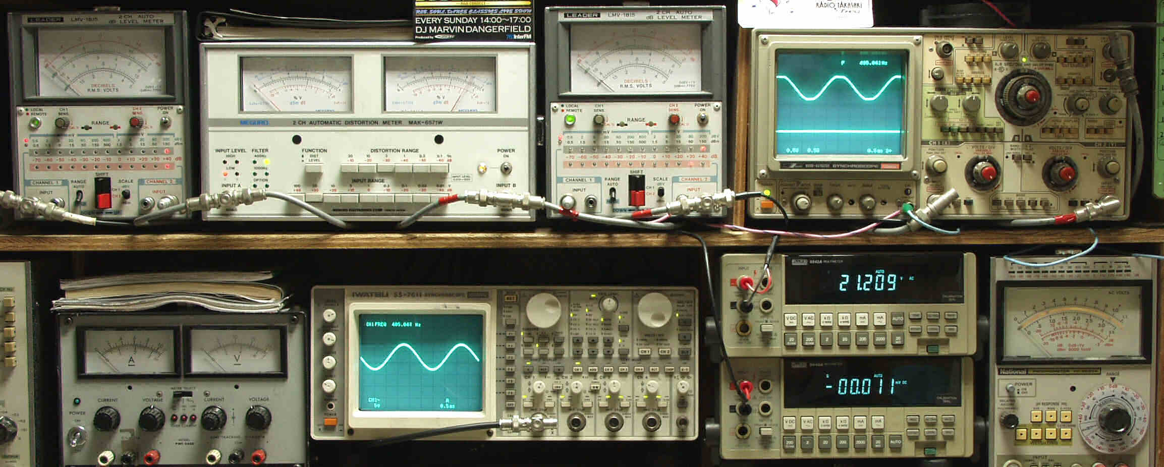 | T. 修理前の測定 T1. 出力・歪み率測定 <見方> 下段左端 オーディオ発振器より400HZ・1KHZの信号を出し(歪み率=約0.003%)これをAMPに入力し、出力を測定 下段中左 オシロ=入力波形(オーディオ発振器のTTLレベル) 下段中右上=周波数計 上段左端 電圧計=L側出力電圧測定、黒針のみ使用 上段中左 歪み率計=出力の歪み率測定 左メータ=L出力、右メータ=R出力 上段中右 電圧計=R側出力電圧測定、赤針のみ使用 上段右端 オシロ=出力波形 上=R出力、下=L出力(実際にはRL電圧計の出力「Max1V」を観測) 下段中右上 デジタル電圧計=R出力電圧測定 下段中右下 デジタル電圧計=L出力電圧測定 |