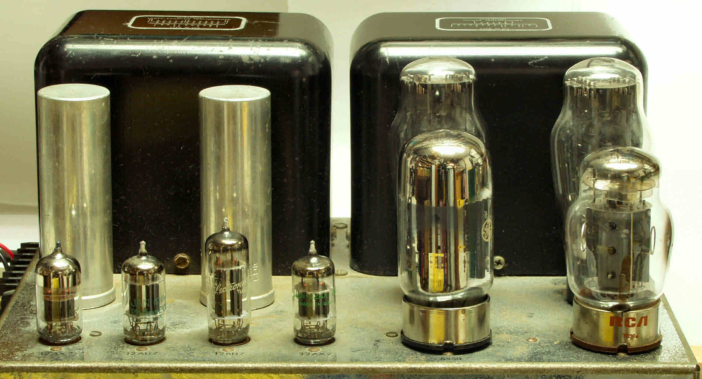 | A53. 点検中 点検中 出力管6550 の比較、左端は新品の6550、右端は新品のKT88 |