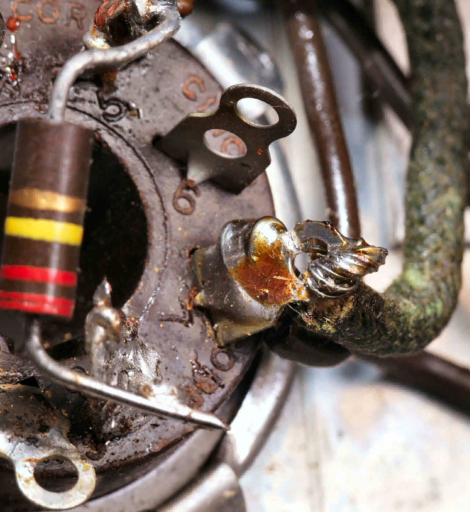 | C12. 修理中 5U4の高圧の配線、半田の角が出ている、AC400Vなので難無きだが100Vになると!! |