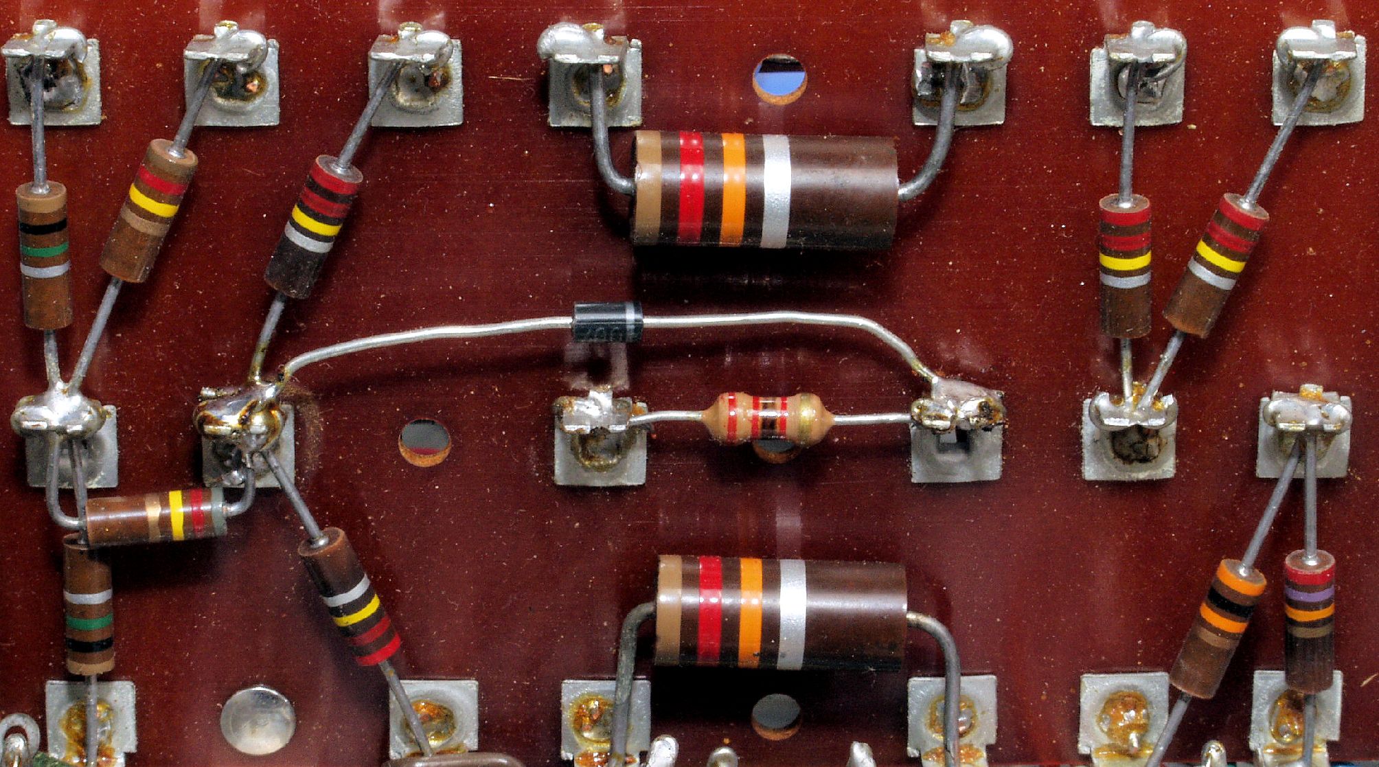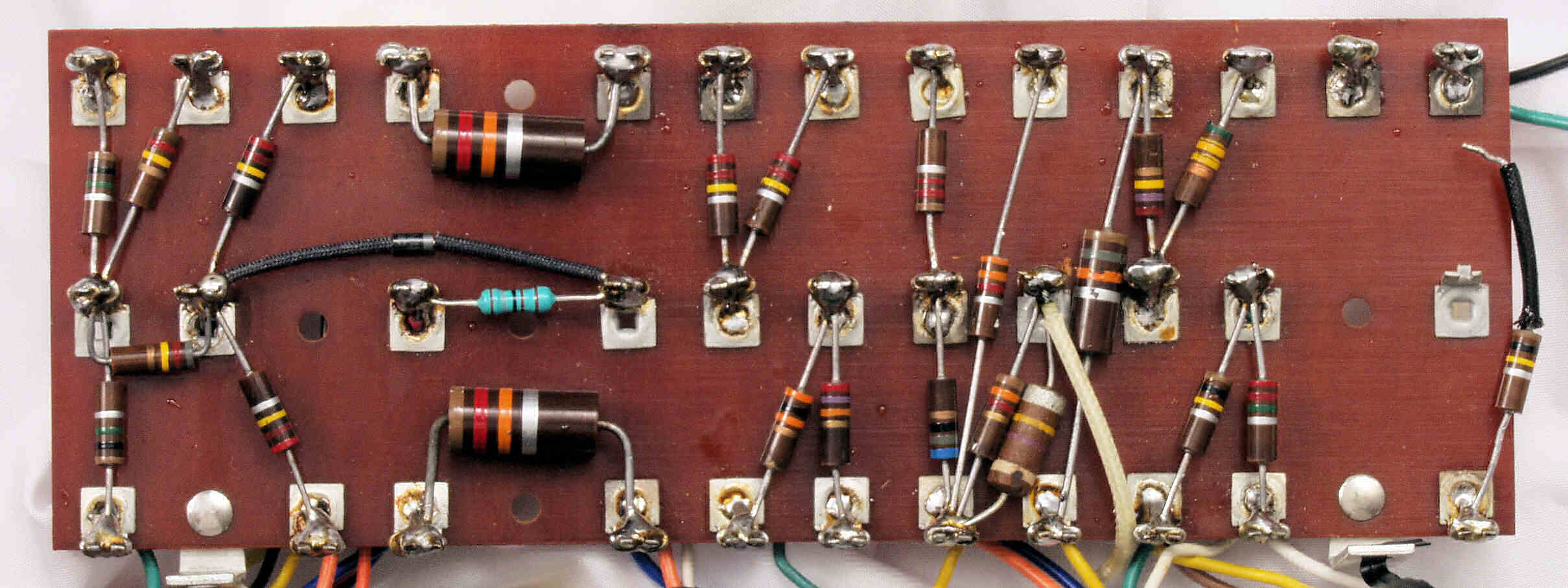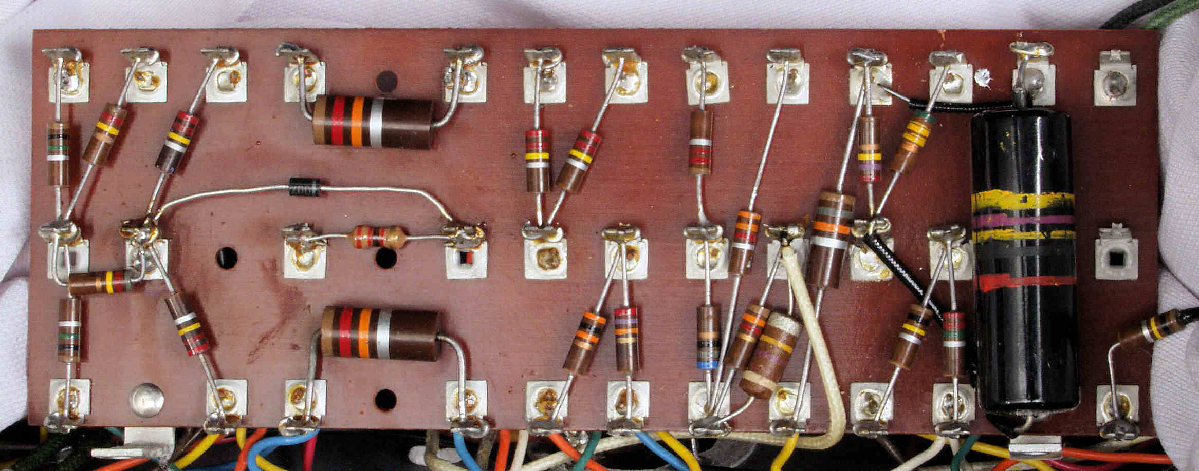| C33. 修理中 基板裏、 コンデンサー・抵抗や渡り線が鳩目で半田止め、端子に絡げていない。 |