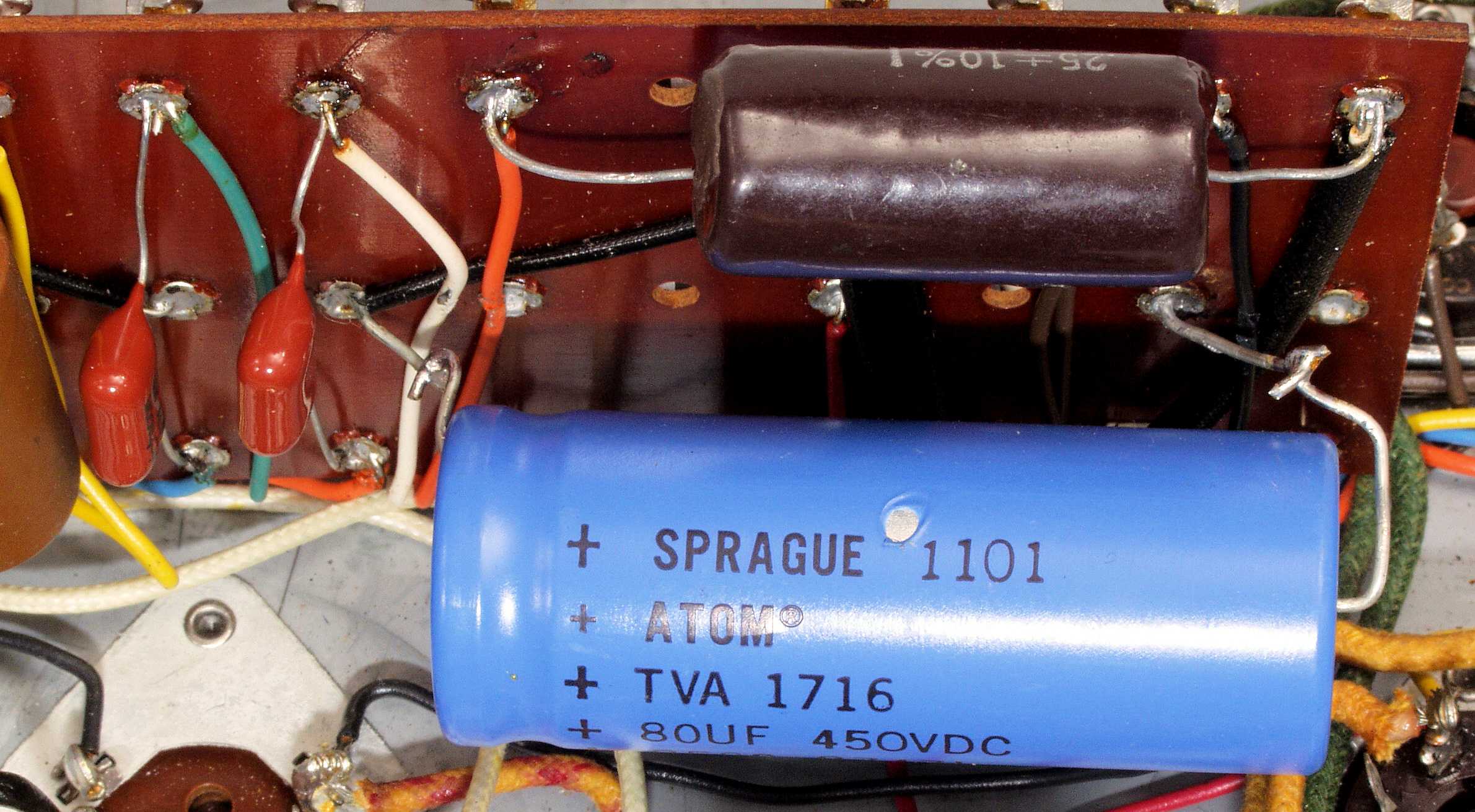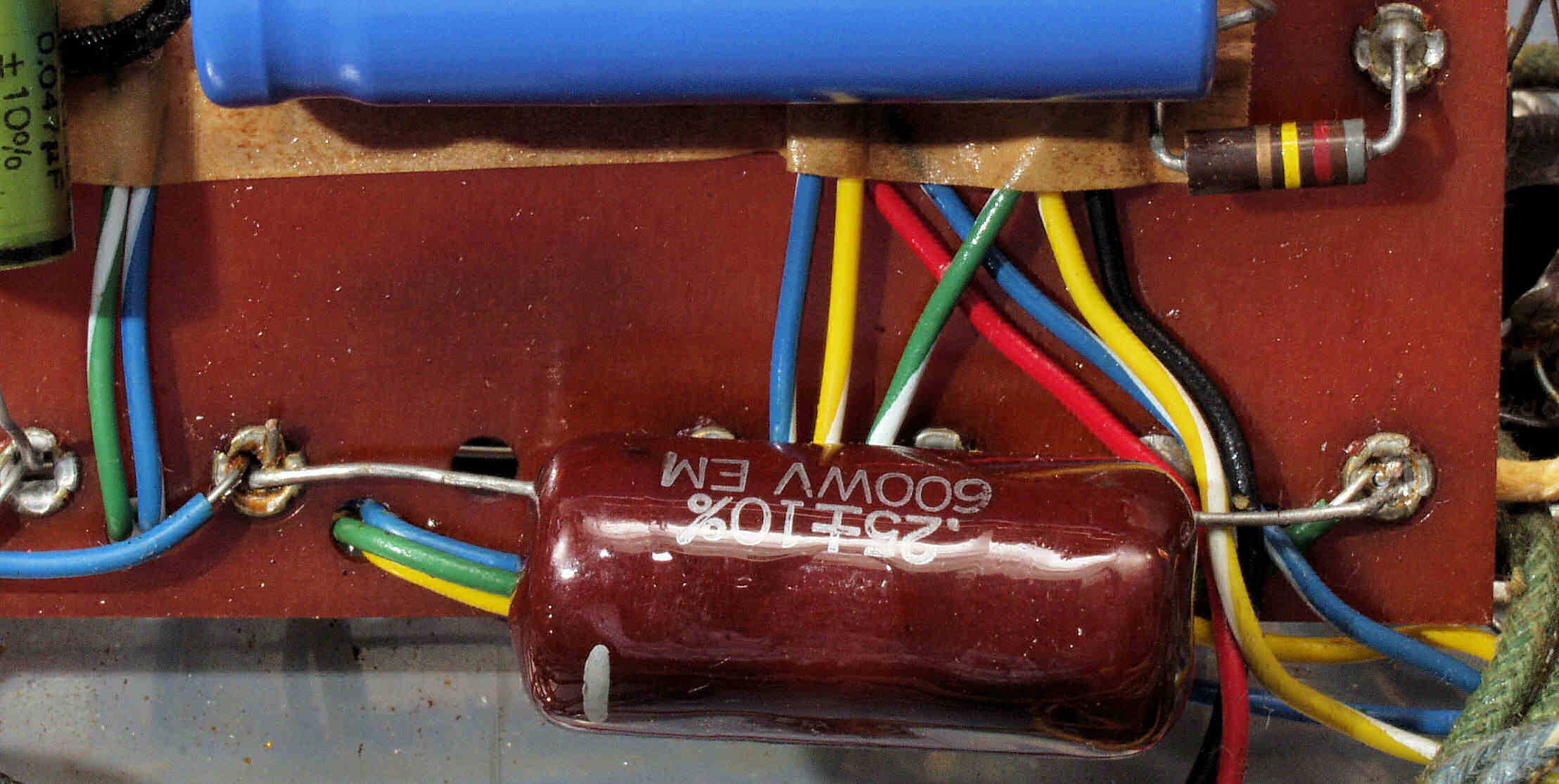 | C313. 修理中 交換された電解コンデンサー、前のリード線を取っていない |