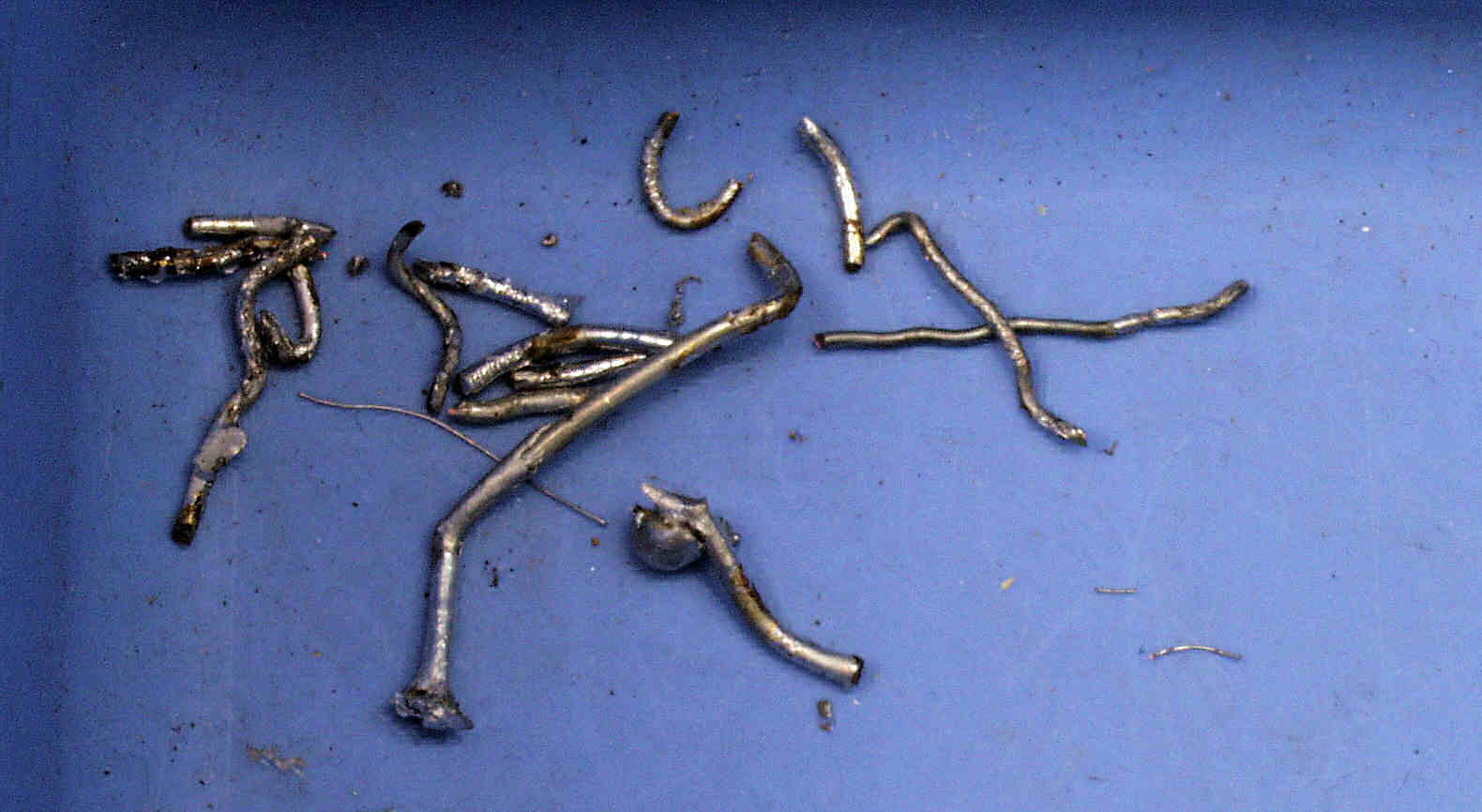 | A63. 点検中 交換された電解コンデンサー、リード線を取るのが大変なので、継ぎ足し! |