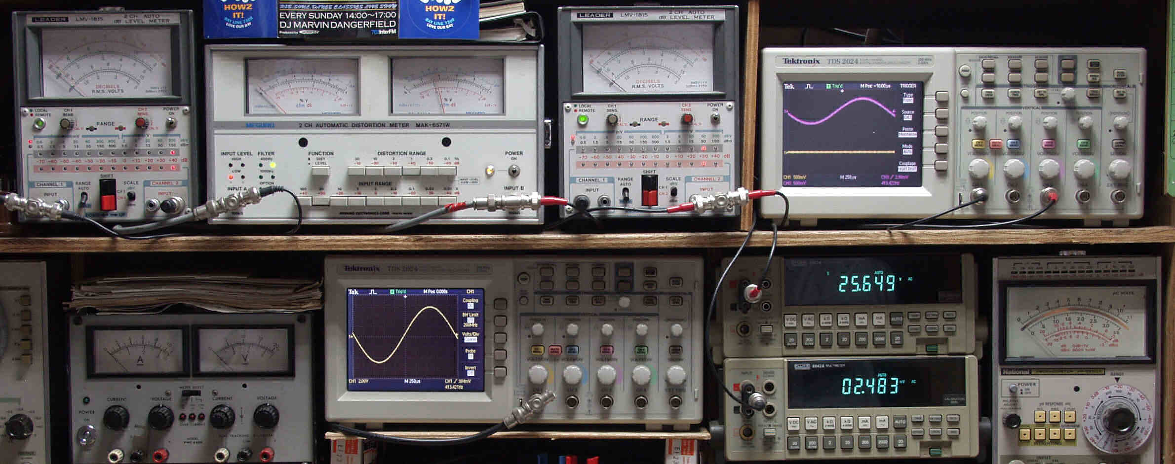 | T. 修理前の測定 T1. 出力・歪み率測定 <見方> 下段左端 オーディオ発振器より400HZ・1KHZの信号を出し(歪み率=約0.003%)これをAMPに入力し、出力を測定 下段中左 オシロ=入力波形(オーディオ発振器のTTLレベル) 下段中右上=周波数計 上段左端 電圧計=L側出力電圧測定、黒針のみ使用 上段中左 歪み率計=出力の歪み率測定 左メータ=L出力、右メータ=R出力 上段中右 電圧計=R側出力電圧測定、赤針のみ使用 上段右端 オシロ=出力波形 上=R出力、下=L出力(実際にはRL電圧計の出力「Max1V」を観測) 下段中右上 デジタル電圧計=R出力電圧測定 下段中右下 デジタル電圧計=L出力電圧測定 |