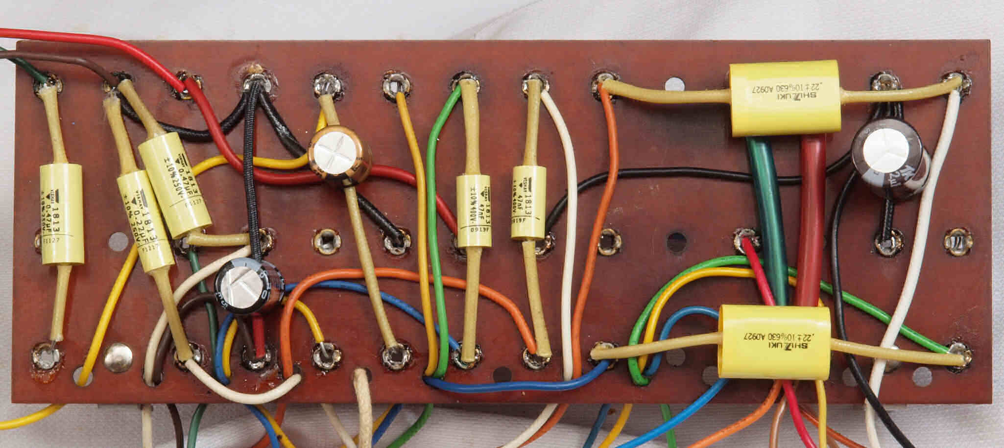 | C412. 修理中 ブロック電解コンデンサー付近。 前回の修理で配線を外すのが面倒なので、配線を付けた端子を切り取り、 端子を切り落とした新しいブロック電解コンデンサーに半田付け! |