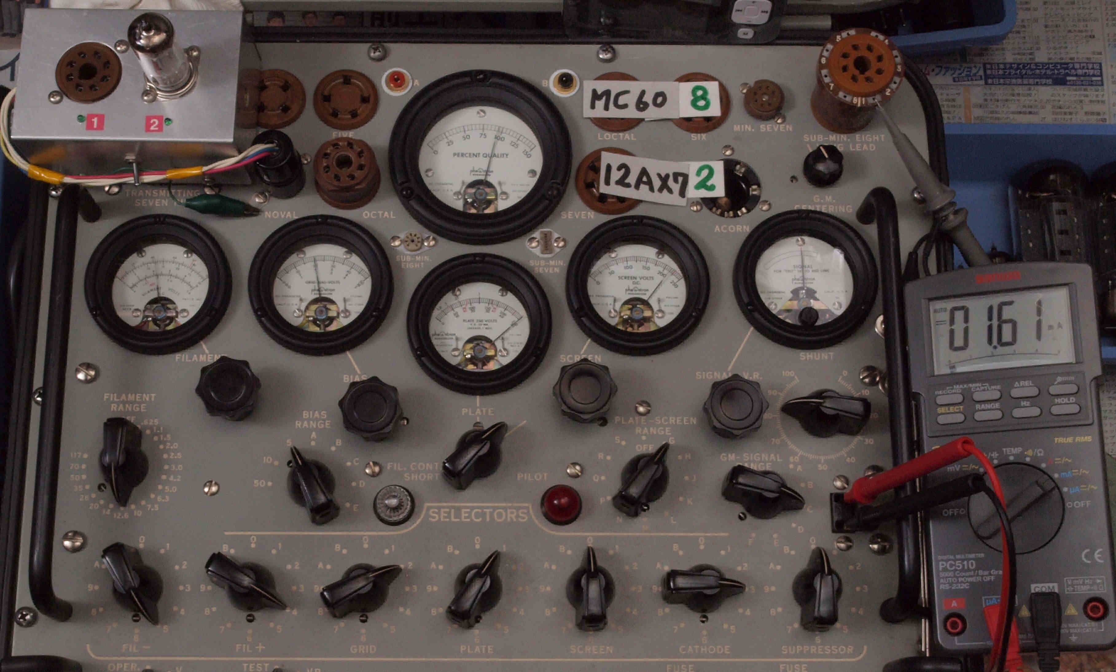 | V11. 購入真空管ECC802S ユニット1。 Gm測定=2200μmho、Ip=15.53mA。 測定条件、「Ep=250V、Eg1=−8.5」、 Cレンジ=6000μmhoレンジでの測定。 |