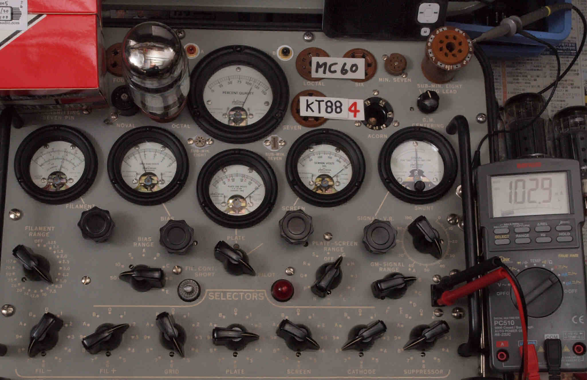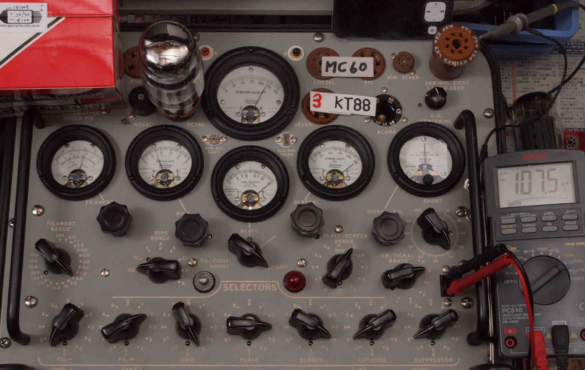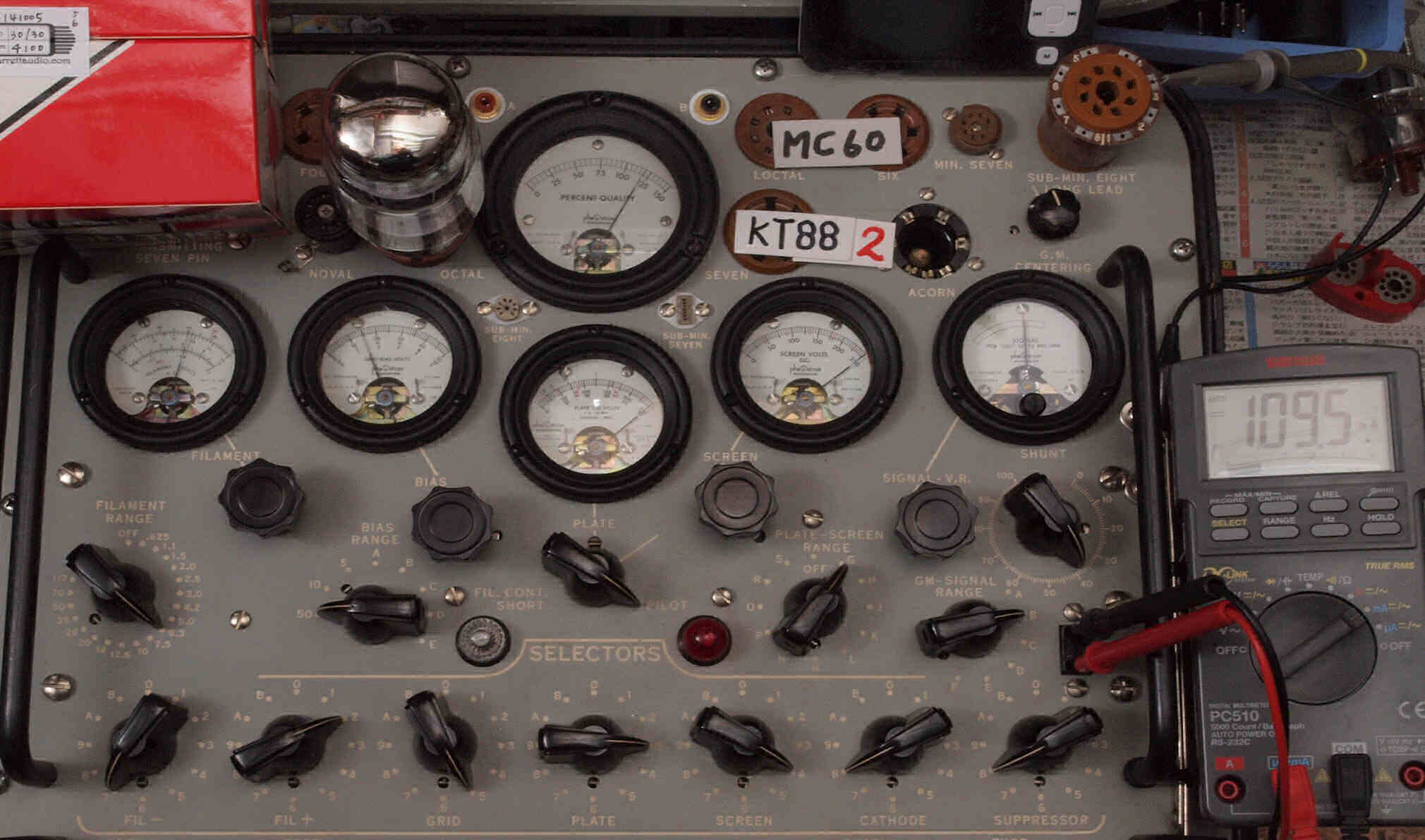 | V91. 購入真空管 KT88 1本目=12500μmho、Ip=110.3mA。 測定条件、「Ep=250V、Esg=250VEg1=−14V」、Bレンジ=15000μmhoレンジでの測定。 |