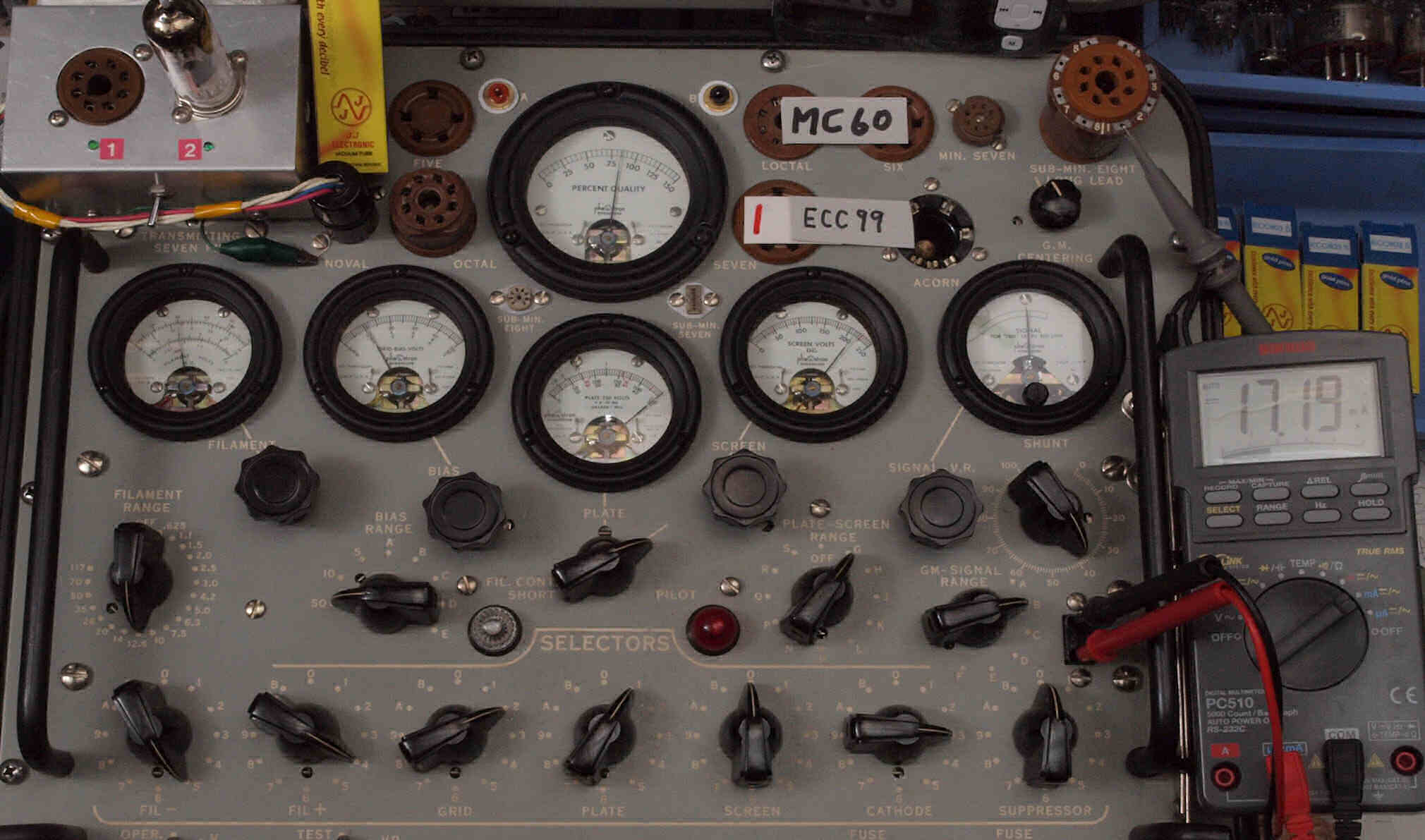 | V31. 購入真空管ECC99 ユニット1。 Gm測定=8500μmho、Ip=17.19mA。 測定条件、「Ep=250V、Eg1=−10.5V」、Bレンジ=15000μmhoレンジでの測定。 |