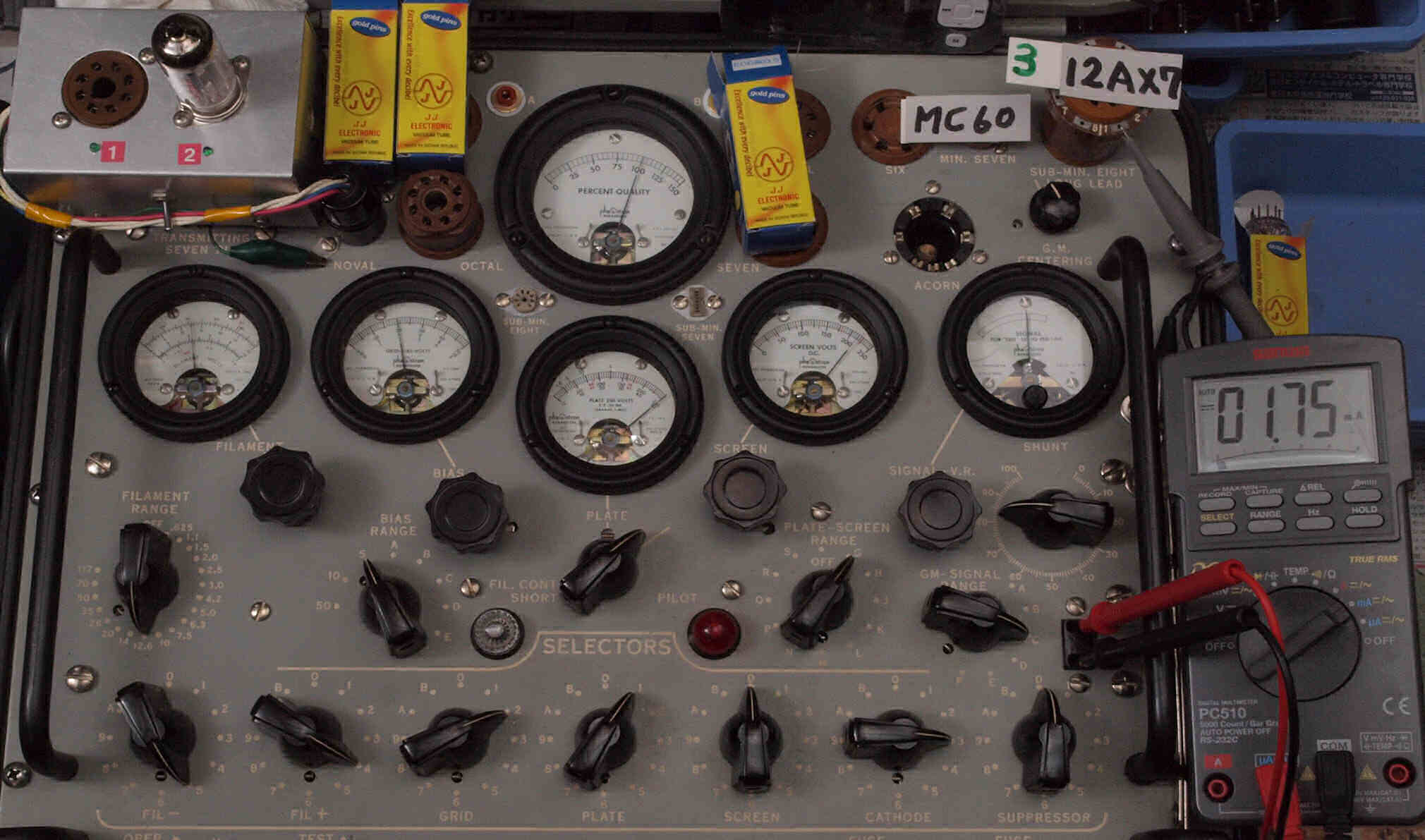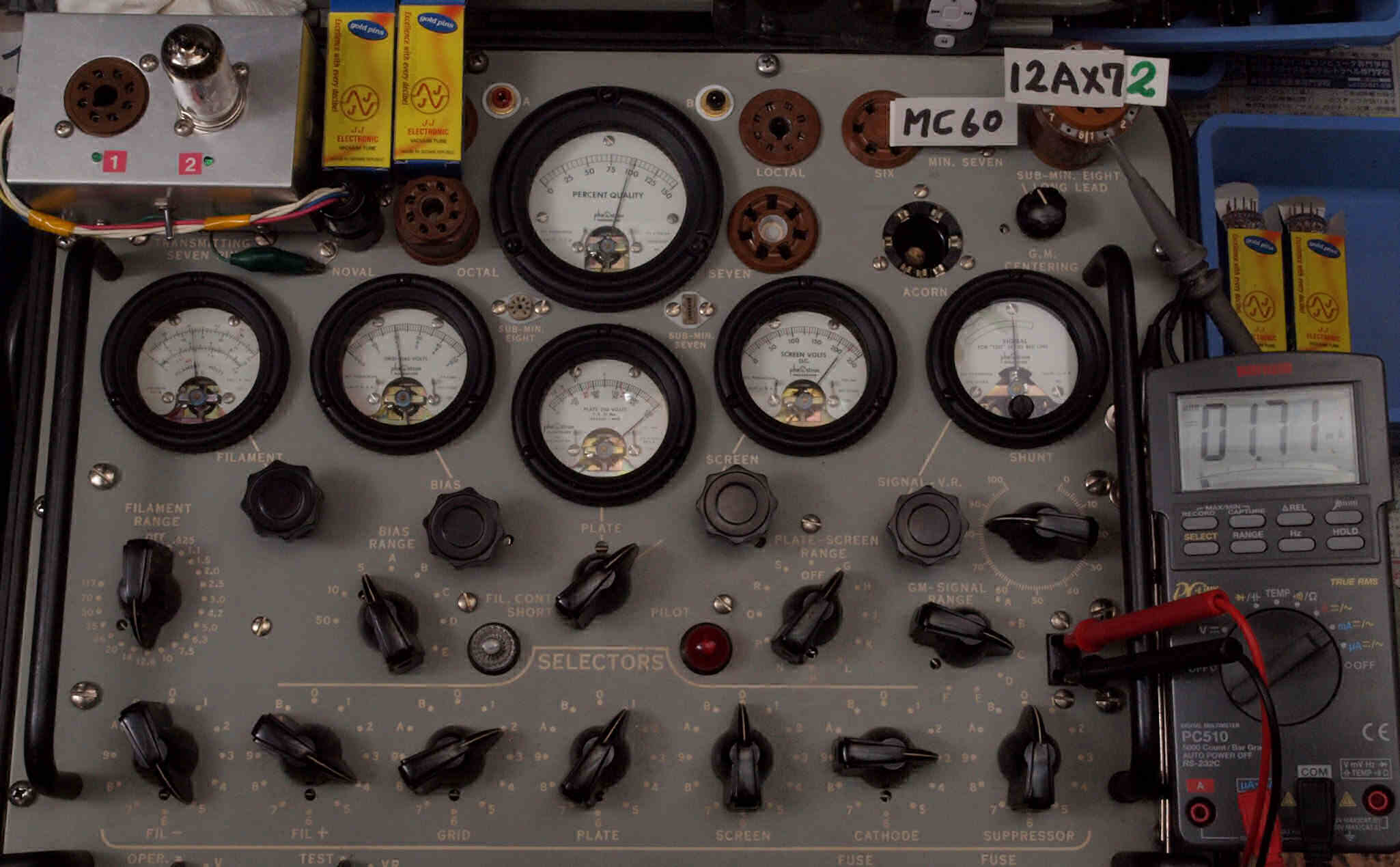 | U31. 付属真空管「12AX7」ユニット1。 Gm測定=1900μmho、Ip=1.59mA。 測定条件、「Ep=250V、Eg1=−2」、 Cレンジ=3000μmhoレンジでの測定。 |