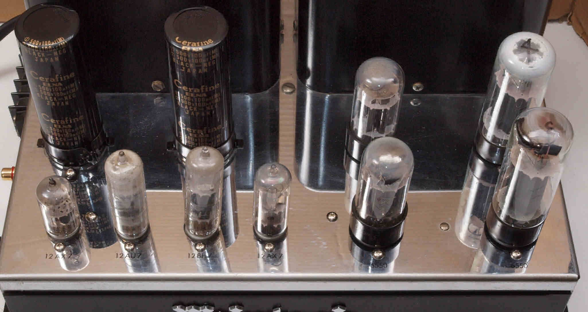 | A61. 点検中 郵送でセンターピンが折れた 終段出力管6550、 左は金属整流管5T4。 | ||||||||||||||||||||||||