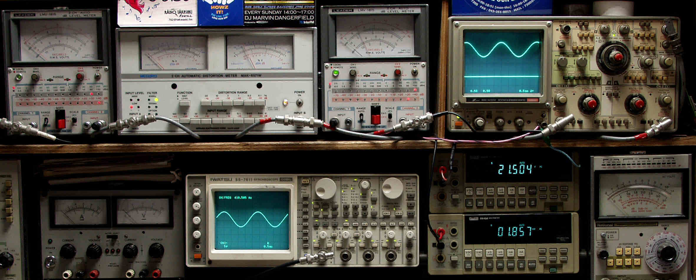 | T. 修理前の測定 T1. 出力・歪み率測定 <見方> 下段左端 オーディオ発振器より400HZ・1KHZの信号を出し(歪み率=約0.003%)これをAMPに入力し、出力を測定 下段中左 オシロ=入力波形(オーディオ発振器のTTLレベル) 下段中右上=周波数計 上段左端 電圧計=L側出力電圧測定、黒針のみ使用 上段中左 歪み率計=出力の歪み率測定 左メータ=L出力、右メータ=R出力 上段中右 電圧計=R側出力電圧測定、赤針のみ使用 上段右端 オシロ=出力波形 上=R出力、下=L出力(実際にはRL電圧計の出力「Max1V」を観測) 下段中右上 デジタル電圧計=R出力電圧測定 下段中右下 デジタル電圧計=L出力電圧測定 |