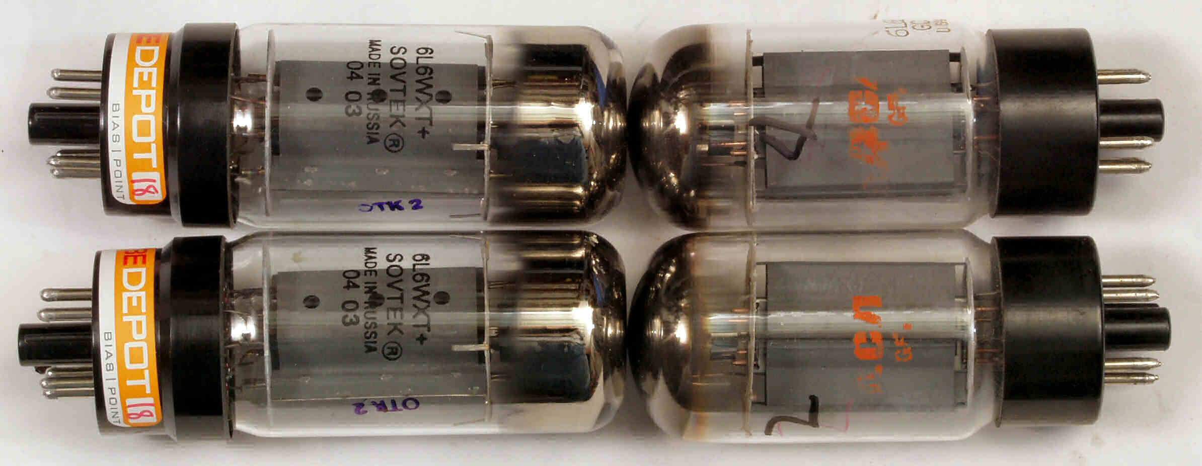 | A81. 点検中 6L6GC比較、左=手持ちの新しいSOVTEKの物、 右=付いているRCAの物。大きな変化は見られない。 | ||||||||||||||||||||||||