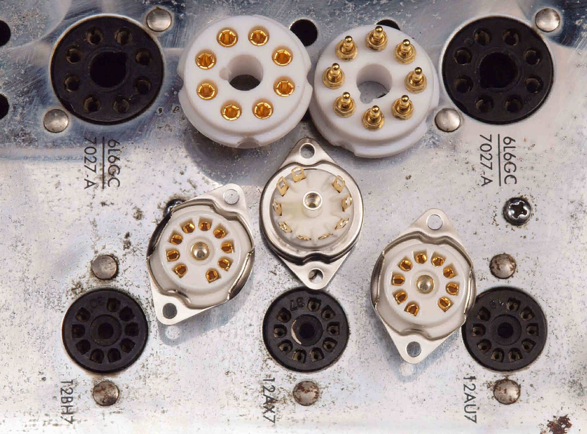 | A31. 点検中 真空管交換する6L6GCのGTソケット、12AX7のMT9ピンソケット比較。 6L6には放熱の良いテフロン絶縁製を使用する。 |