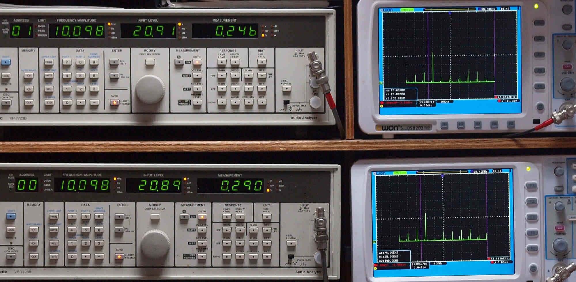 | E. 測定・調整。 画像をクリックすると、大きく(横幅2050ドット)表示されます。 E0. 出力・歪み率測定・調整 「見方」。 上段中 右側SP出力を「Audio Analyzer Panasonic VP−7723B」により測定。 表示LED、 左端=メモリーNo、 中左=周波数測定、 中右=出力電圧測定、 右端=歪み率測定。 上段右端 VP−7723Bの基本波除去出力を「owon SDS8202(200MHZ)」で「FFT分析」表示。 下段中 左側SP出力を「Audio Analyzer Panasonic VP−7723B」により測定。 表示LED、 左端=メモリーNo、 中左=周波数測定、 中右=出力電圧測定、 右端=歪み率測定。 下段右端 VP−7723Bの基本波除去出力を「owon SDS6062(200MHZ)」で「FFT分析」表示。 下段左端 オーディオ発振器 VP−7201A より50Hz〜100kHzの信号を出し(歪み率=約0.003%)、ATT+分配器を通し、AMPに入力。 よって、ダイアル設定出力レベルより低くなります。測定機器の仕様や整備の様子はこちら、「VP−7723B」「VP−7201A」。 FFT画面の見方はこちら。 |