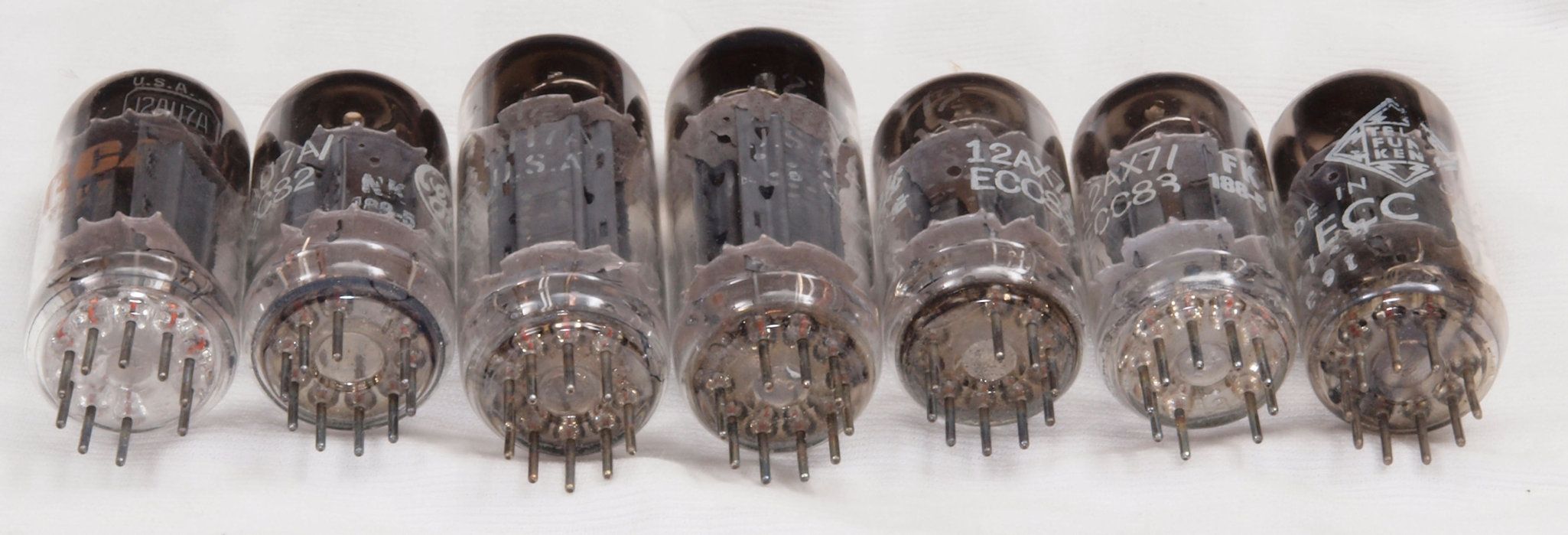 | 付属真空管、左から「12AU7(ECC82)」1本目、2本目、「12BH7」1本目、2本目、「12AX7(ECC83)」1本目、2本目、3本目。 | ||||||||||||||||||||||||