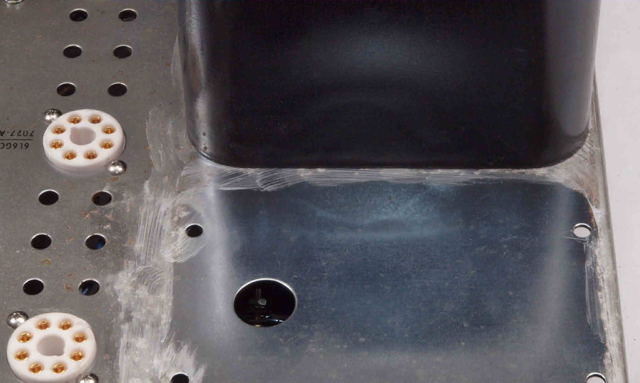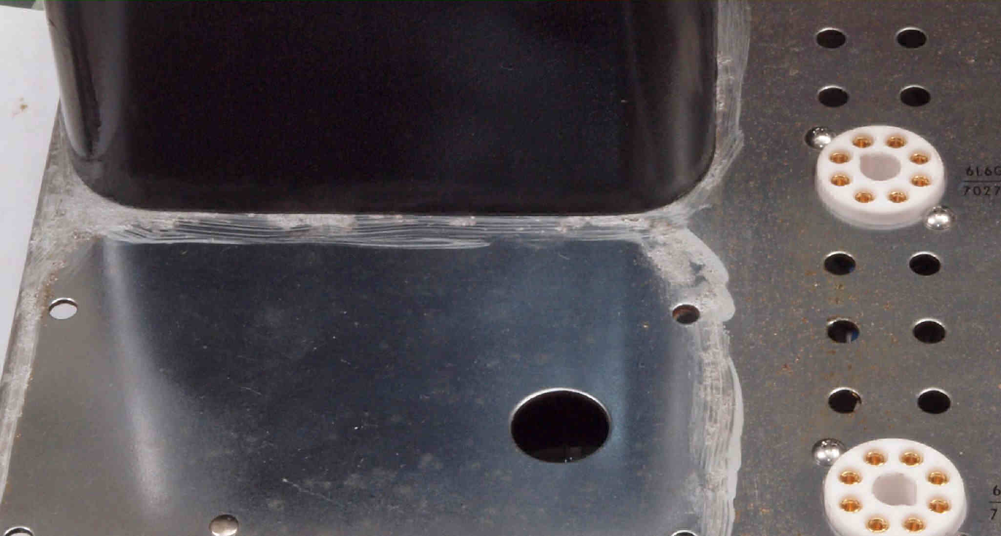 | C63. 修理後 ブロック電解コンデンサーとチョークトランスのシャーシ裏。 | ||||||||||||||||||||||||