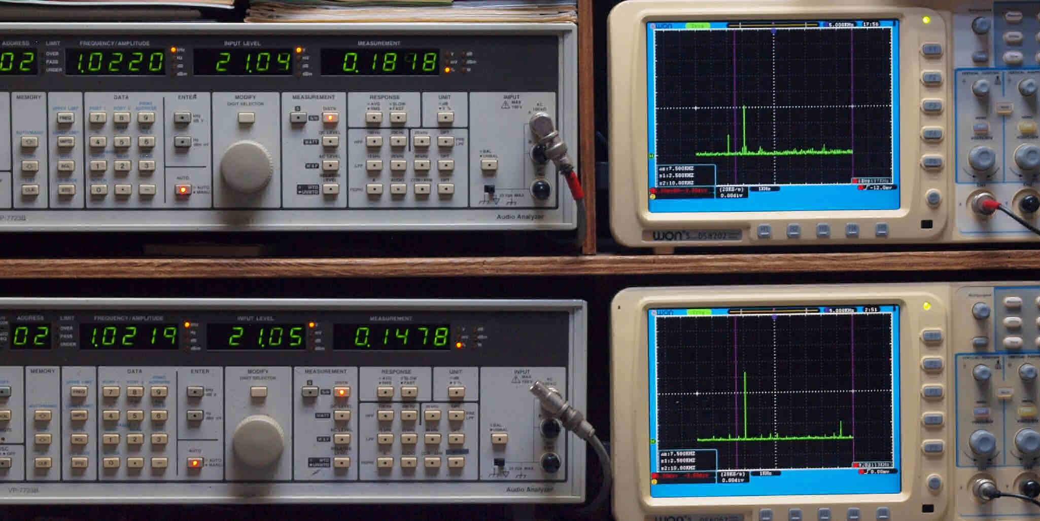 | E. 測定・調整。 画像をクリックすると、大きく(横幅2050ドット)表示されます。 E0. 出力・歪み率測定・調整、 電源電圧=117V。 「見方」。 上段中 右側SP出力を「Audio Analyzer Panasonic VP−7723B」により測定。 表示LED、 左端=メモリーNo、 中左=周波数測定、 中右=出力電圧測定、 右端=歪み率測定。 上段右端 VP−7723Bの基本波除去出力を「owon SDS8202(200MHZ)」で「FFT分析」表示。 下段中 左側SP出力を「Audio Analyzer Panasonic VP−7723B」により測定。 表示LED、 左端=メモリーNo、 中左=周波数測定、 中右=出力電圧測定、 右端=歪み率測定。 下段右端 VP−7723Bの基本波除去出力を「owon SDS6062(200MHZ)」で「FFT分析」表示。 下段左端 オーディオ発振器 VP−7201A より50Hz〜100kHzの信号を出し(歪み率=約0.003%)、ATT+分配器を通し、AMPに入力。 よって、ダイアル設定出力レベルより低くなります。測定機器の仕様や整備の様子はこちら、「VP−7723B」「VP−7201A」。 FFT画面の見方はこちら。 |