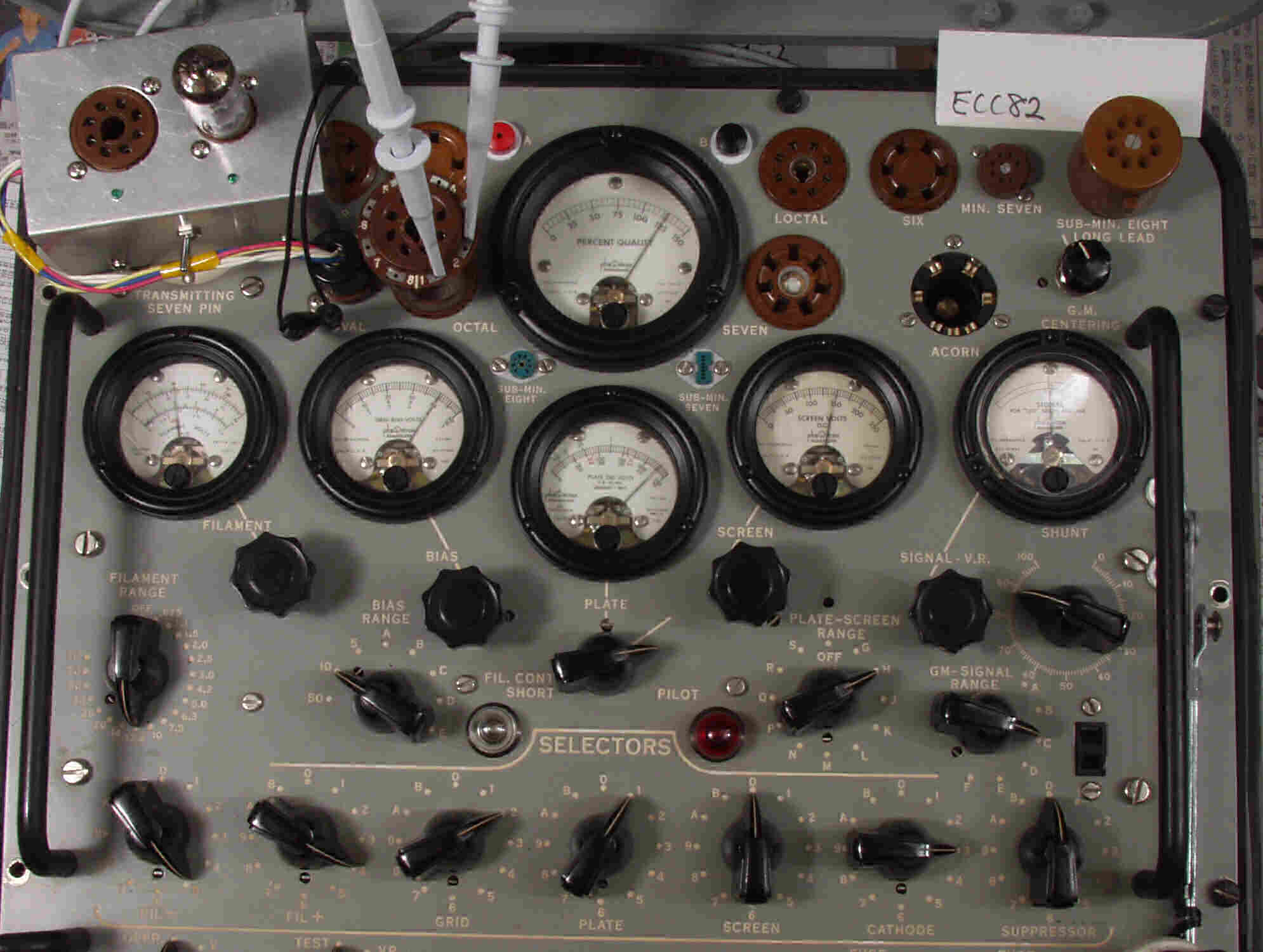| T61. 付属ECC82「1」ユニット1測定=2500μmho Cレンジ=3000μmhoレンジでの測定、「Ep=225V、Eg1=−8V」 真空管ハンドブック(規格表)の、 「ECC82」相互コンダクタンス=2200μmho、 「Ep=250V、Eg1=−8.5V、IP=10.5mA」。 1960/1962/1964/1966ナショナル真空管ハンドブック、1995オーディオ用真空管マニアル、60/62/69東芝電子管ハンドブック、1962日立電子管ハンドブック、1965/1971全日本真空管マニュアル、RC15/19/26/27/28/29/30 Receiving Tube Manual、1966実用真空管ハンドブック、1995世界の真空管カタログより。 |