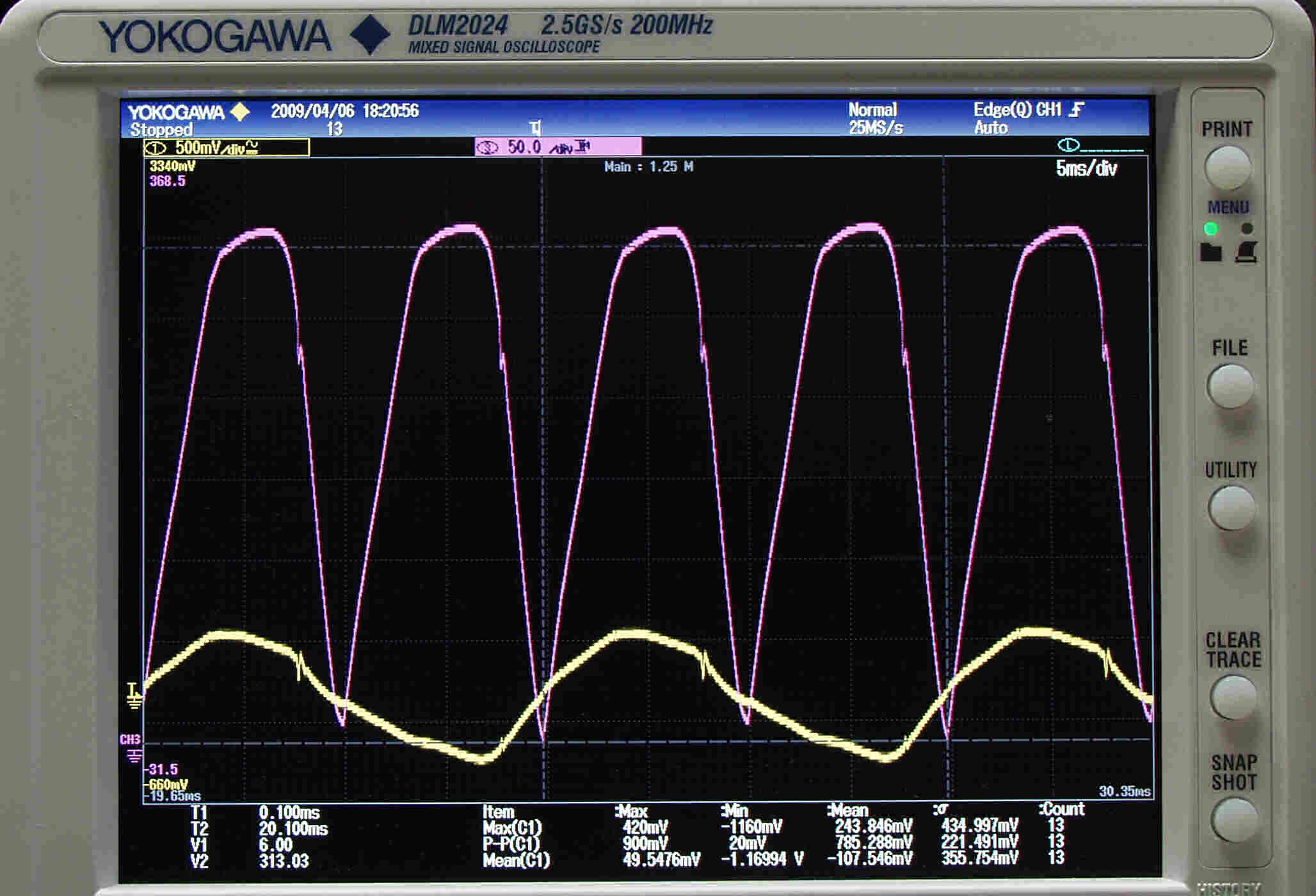 | T43. 付属ECC83「2」測定の入出力波形、赤色=グリッド電圧、黄色=プレート電圧 | ||||||||||||||||||||||||
