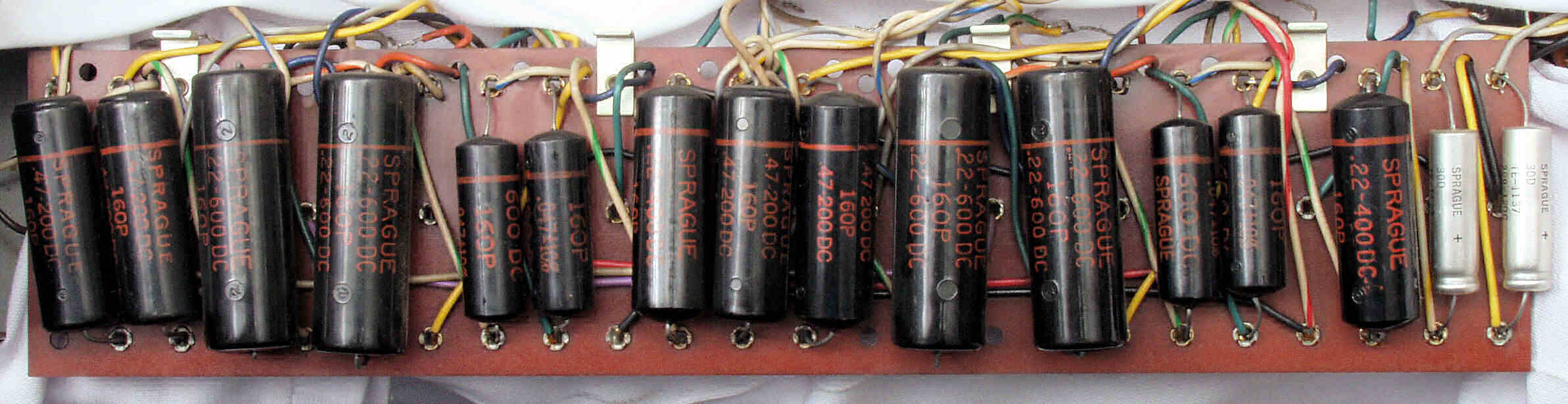 | A82. 点検中 整流用電解コンデンサーの比較、 上=付いている物(100μF/500WV+30μF/450WV))、下=交換する者(100μF×2/500WV)) |