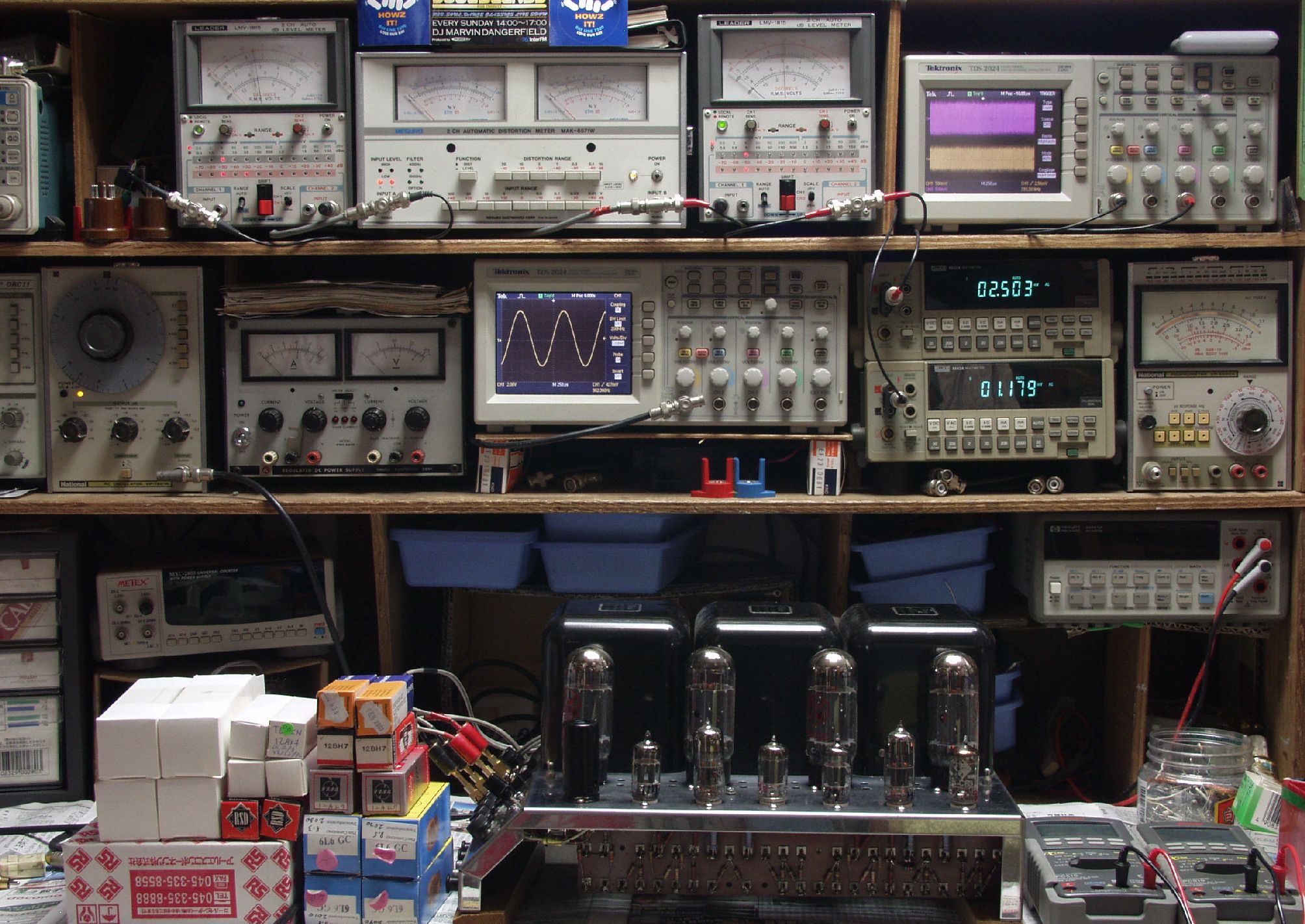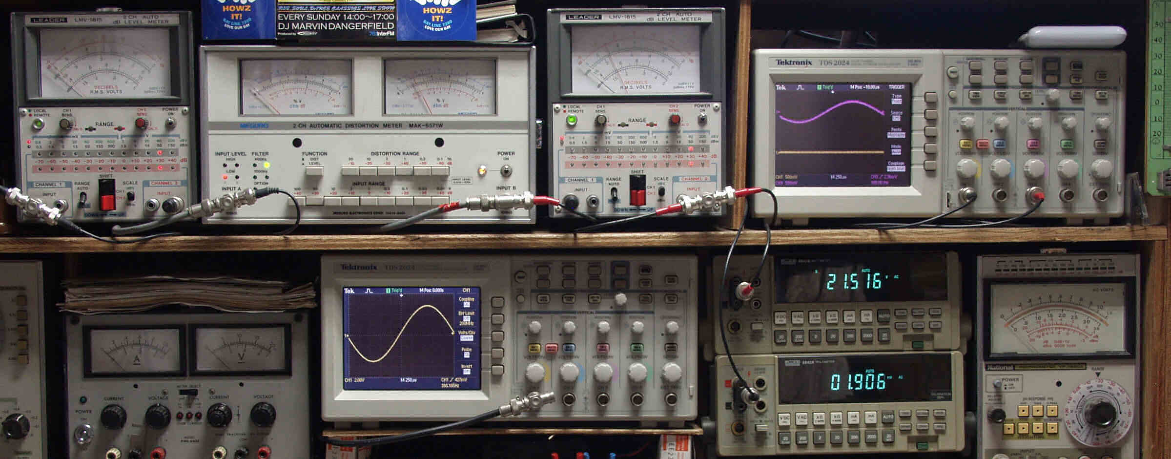 | E. 調整・測定 E1. 調整・出力測定 <見方> 下段左端 オーディオ発振器より400HZ・1KHZの信号を出し(歪み率=約0.003%)これをAMPに入力し、出力を測定 下段中左 オシロ=入力波形(オーディオ発振器のTTLレベル) 下段中右上=周波数計 上段左端 電圧計=L側出力電圧測定、黒針のみ使用 上段中左 歪み率計=出力の歪み率測定 左メータ=L出力、右メータ=R出力 上段中右 電圧計=R側出力電圧測定、赤針のみ使用 上段右端 オシロ=出力波形 上=R出力、下=L出力(実際にはRL電圧計の出力「Max1V」を観測) 下段中右上 デジタル電圧計=R出力電圧測定 下段中右下 デジタル電圧計=L出力電圧測定 個人輸入器なので電源電圧は115V−50HZ |