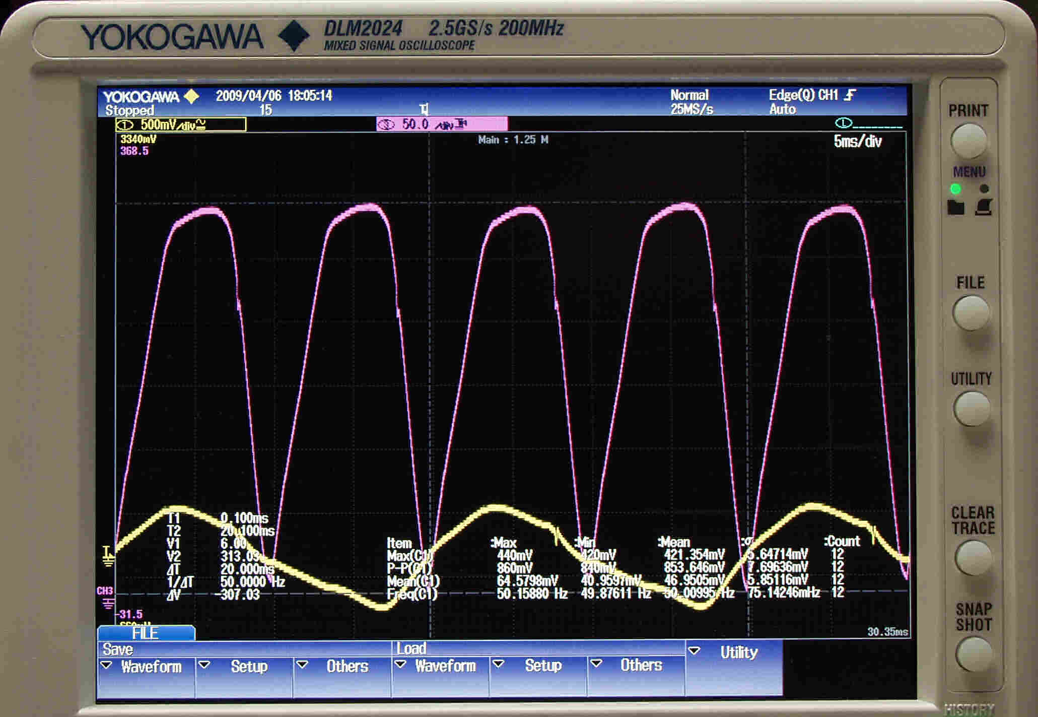| A43. 点検中 パワーサミスターの電圧測定 約3.1V 給電源電圧115V−3.1V=111.9V 何と高いステップアップを使用しなくて、一般のトランスが使用できる 使用出来るトランス A.12V/3Aのヒータートランス 100V+12V=112V B.5V/3Aと6.3V/3Aのヒータートランス 100V+5V+6.3V=111.3V 但し、突入電流(ラッシュカレント)対策が必要 |