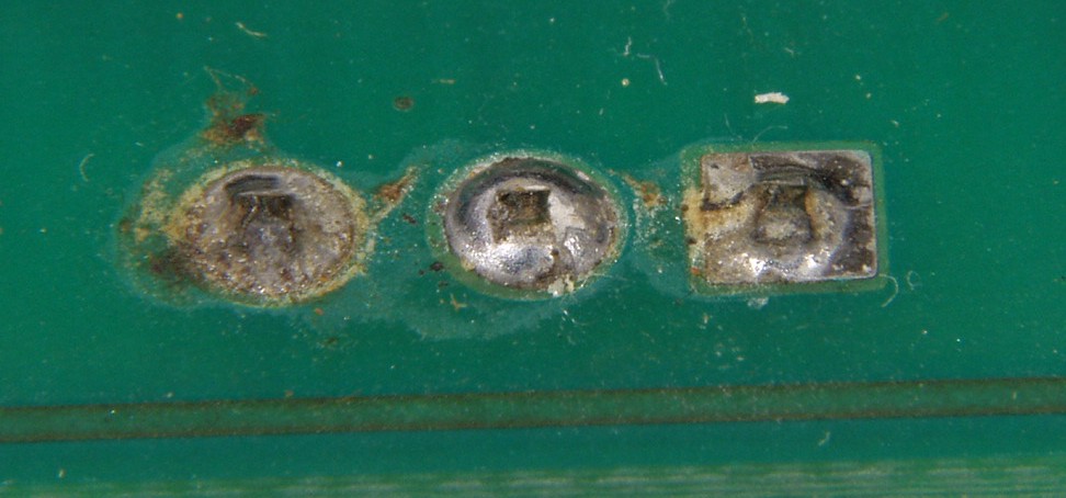 | A2B. 点検中 ハンダが腐食している。 白く見える所=酸化鉛は不導体となるので始末が悪い。 又、この部質は、普通のハンダの融点をはるかに超えるので、ハンダ補正は大変な時間が掛かる |