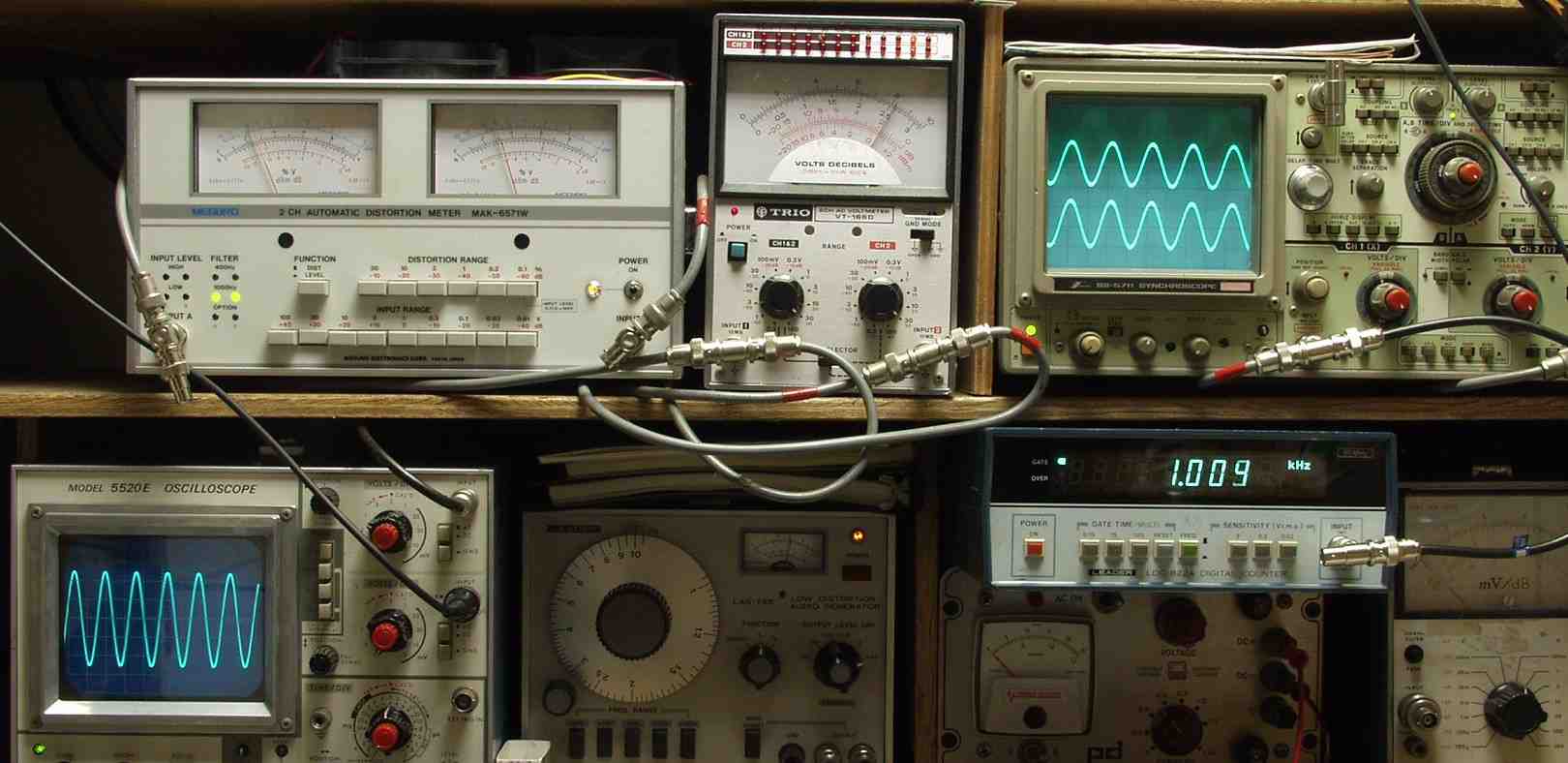 | E. 調整・測定 E1. 調整・出力測定 <見方> 下左オーデオ発振器より400HZ&1KHZの信号を出す(歪み率は約0.003%) 1.下中の測定器−−入力波形(オーデオ発振器のTTLレベル) 2.下右の測定器−−周波数計 3.上左の測定器−−SP出力の歪み率測定。 左メ−タ−−−Left出力。右メ−タ−−−Right出力 4.上中の測定器−−SP出力電圧測定器。 赤針=Right出力。 黒針=Left出力 5.上右の測定器−−SP出力波形オシロ。 上−−Right出力。下−−Left出力(出力電圧測定器の出力) |