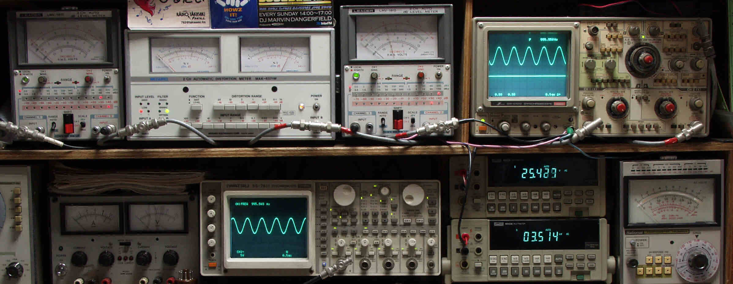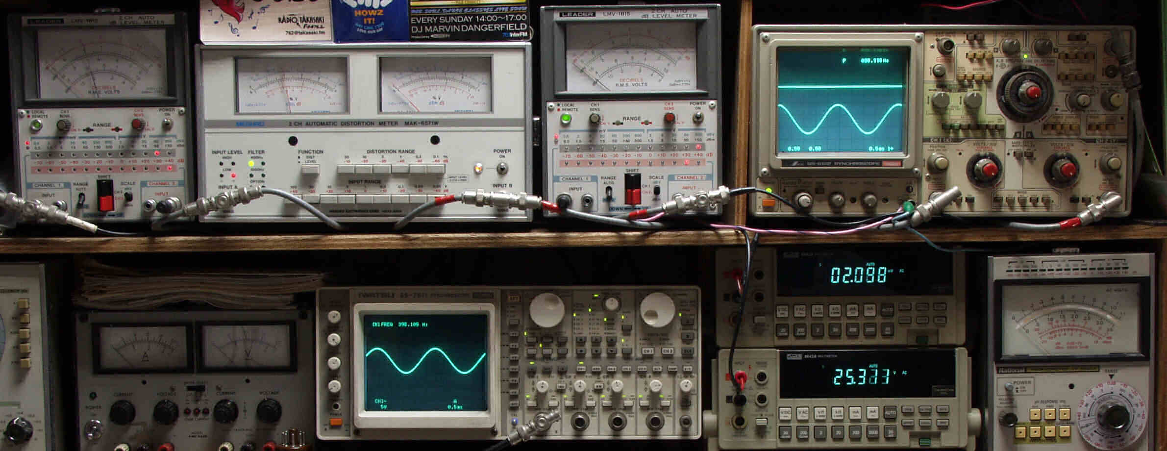 | E. 測定・調整 E1. 出力・歪み率測定・調整 <見方> 下段左端 オーディオ発振器より400HZ・1KHZの信号を出し(歪み率=約0.003%)これをAMPに入力し、SP出力を測定 下段中左 オシロ=入力波形(オーディオ発振器のTTLレベル) 下段中右上=周波数計 上段左端 電圧計=L側SP出力電圧測定、黒針のみ使用 上段中左 歪み率計=SP出力の歪み率測定 左メータ=L出力、右メータ=R出力 上段中右 電圧計=R側SP出力電圧測定、赤針のみ使用 上段右端 オシロ=SP出力波形 上=R出力、下=L出力(実際にはRL電圧計の出力「Max1V」を観測) 下段中右上 デジタル電圧計=SP出力電圧測定RLは切り替えて測定 |