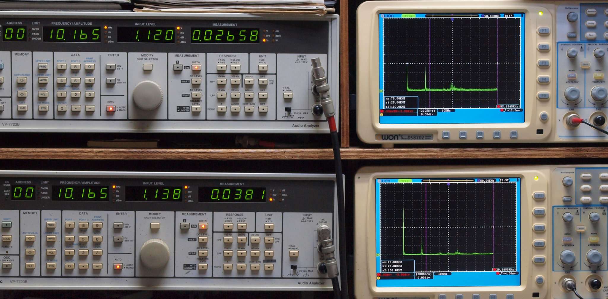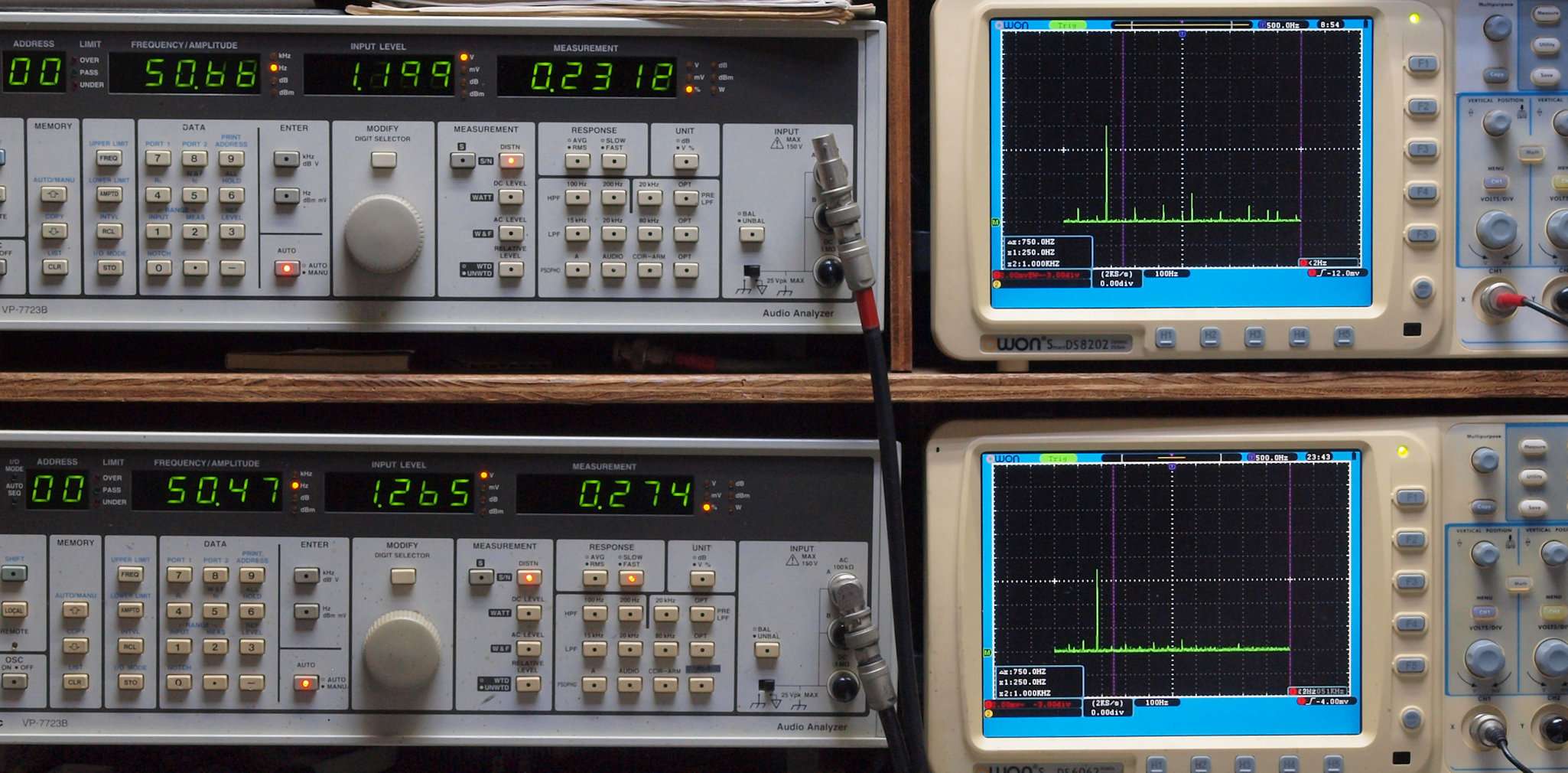 よって、ダイアル設定出力レベルより低くなります。測定機器の仕様や整備の様子はこちら、「VP−7723B」「VP−7201A」。 FFT画面の見方はこちら。