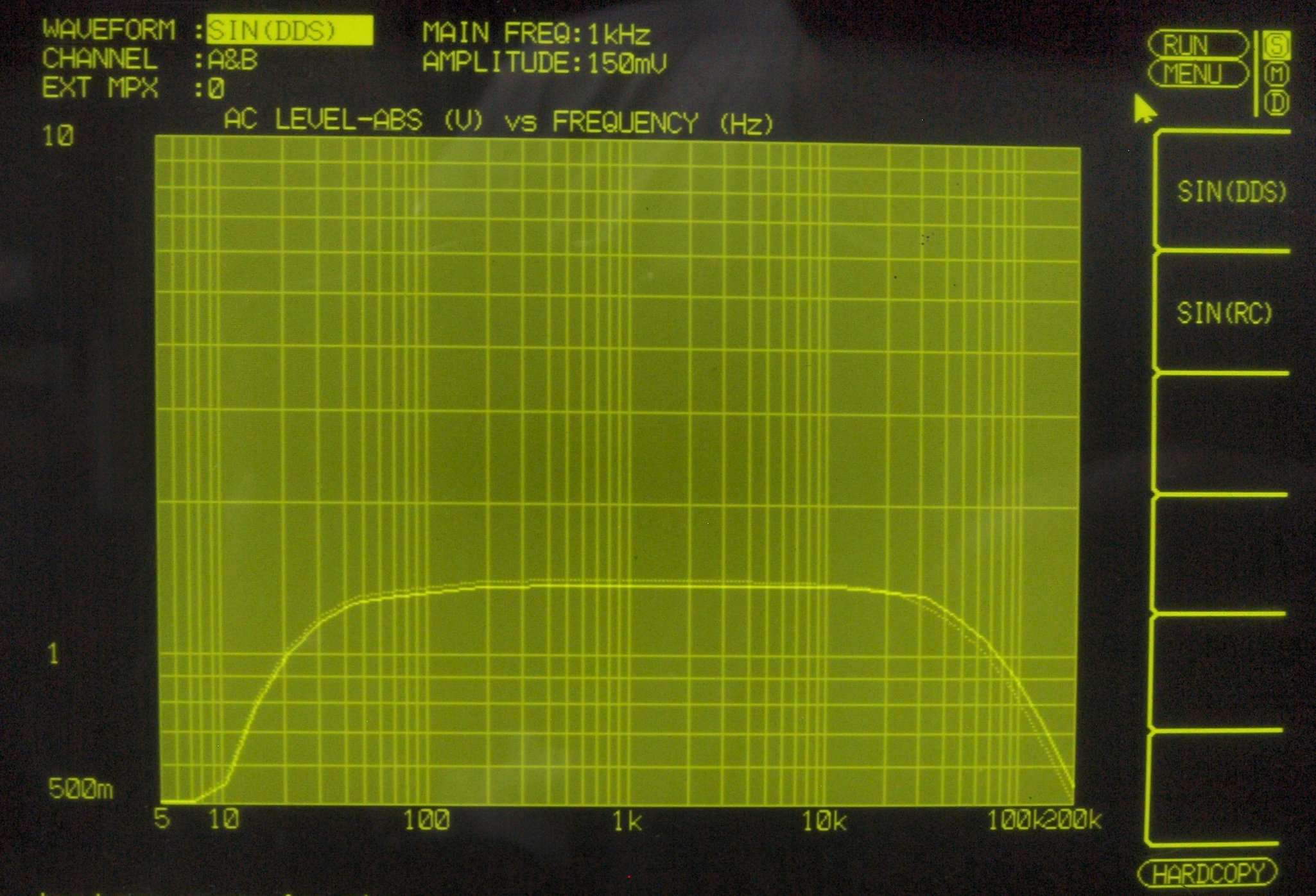 HF11. 入出力特性測定(AUX入力)。 AUX入力端子に150mVを入力。出力=1V。 VRはMax位置。