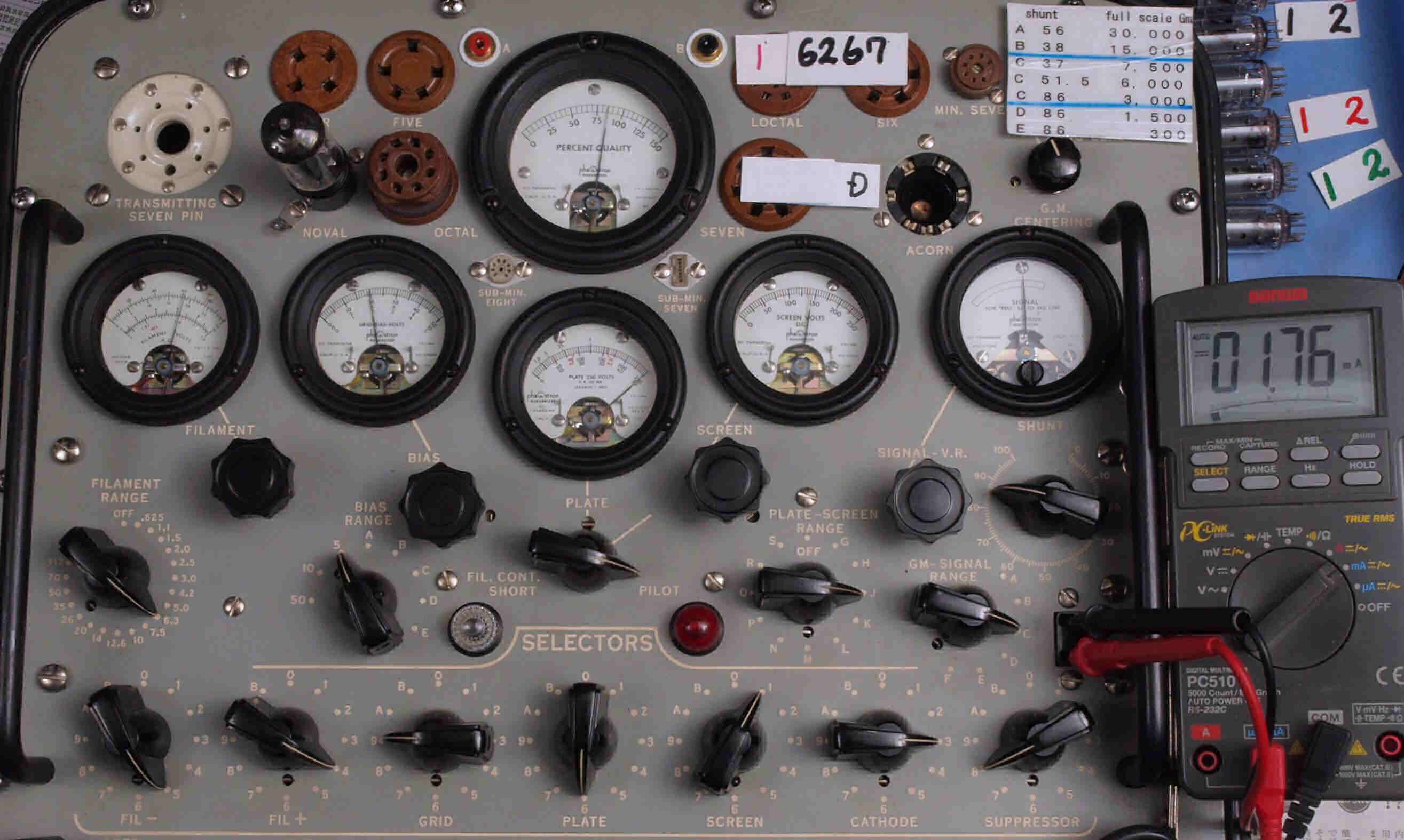 | U11. 付属1本目「6267」。 Gm測定=1700μmho、IP=1.76mA。 Cレンジ=3000μmhoレンジでの測定、「Ep=250V、Esg=150V、Eg1=−2V」 現在の新品製品の測定はこちら |