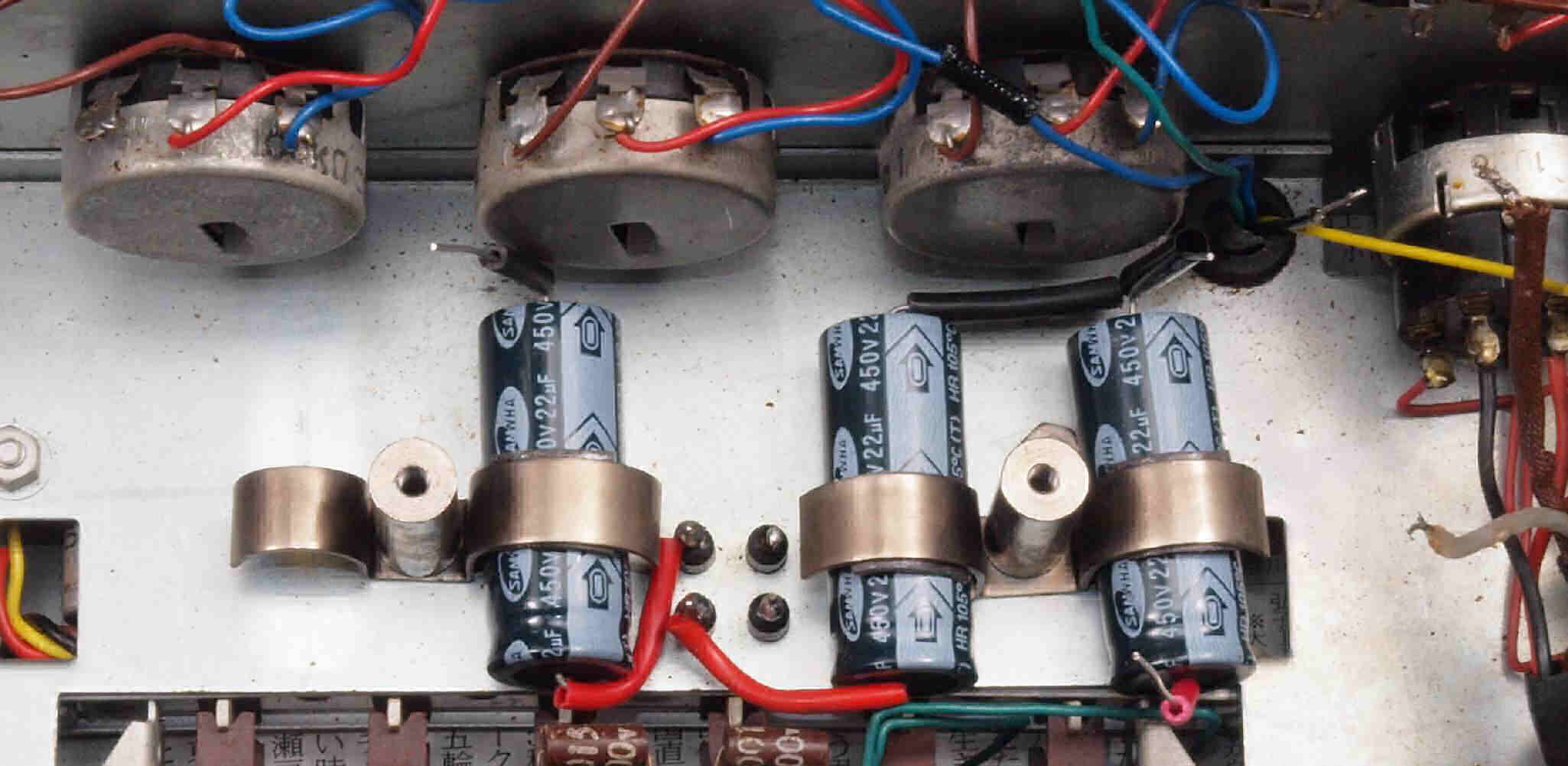 | C22. 修理後 ケースから出し、下から見る。 電解コンデンサー1個、フイルムコンデンサー4個交換。 | ||||||||||||||||||||||||||