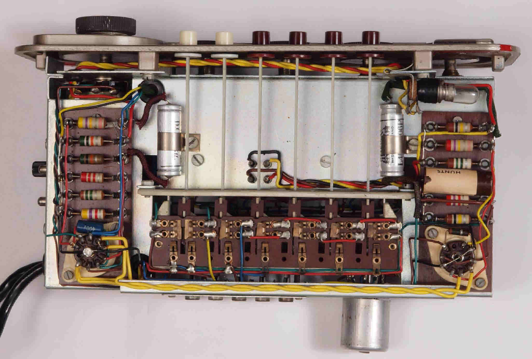 C15. 修理後 ケースから出し、上から見る。 電解コンデンサー3個、フイルムコンデンサー2個交換。