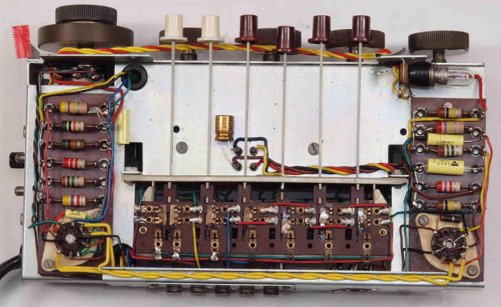 C22. 修理後 ケースから出し、下から見る。 電解コンデンサー1個、フイルムコンデンサー4個交換。